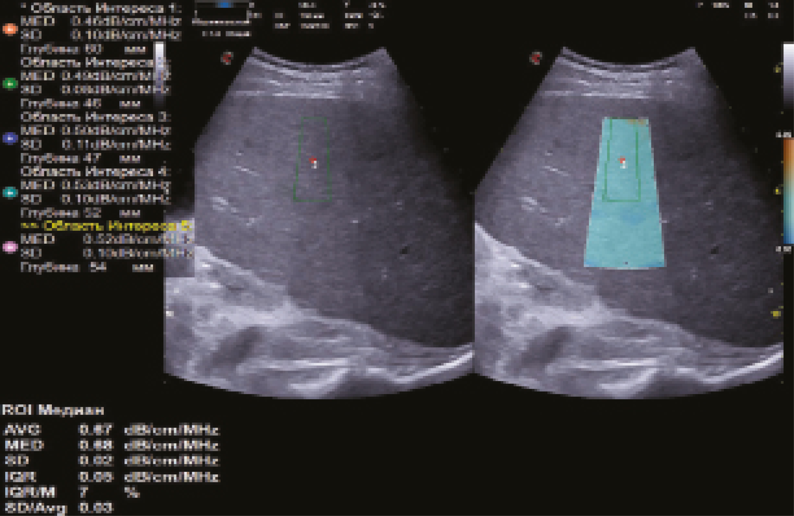 Рис. 6. Варианты проведения количественной ультразвуковой стеатометрии печени с различием в глубине расположения региона интереса (РИ) в паренхиме печени