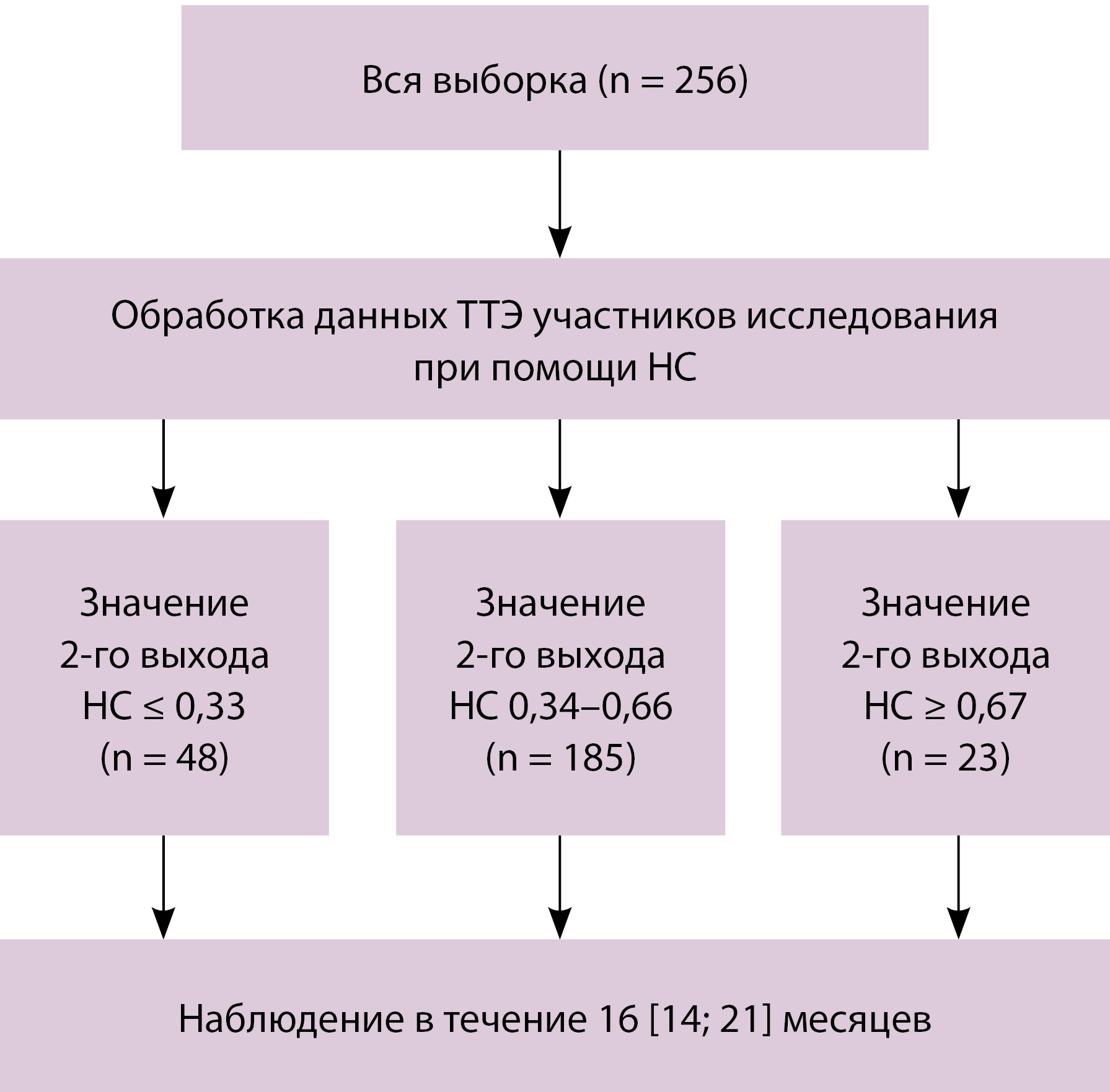 Показатели ТТЭ участников исследования были обработаны НС, в результате чего для каждого участника получены значения первого и второго выходов НС от 0 до 1. Для исследования использовали значения второго нейрона выходного слоя НС. Предполагалось, что чем выше значение числа, полученного на втором выходе, тем меньше параметры ТТЭ соответствуют ФП и тем ниже вероятность развития ФП у пациента в периоде наблюдения. Для разделения на группы мы выбрали 3 диапазона значений второго выхода НС: от 0 до 0,33; от 0,34 до 0,66 и от 0,67 до 1,0. Участники со значением выхода НС ≤ 0,33 были отнесены к группе высокой вероятности развития ФП, участники со значением выхода НС 0,34–0,66 – к группе промежуточной вероятности развития ФП, участники со значением выхода НС ≥ 0,67 – к группе низкой вероятности развития ФП.