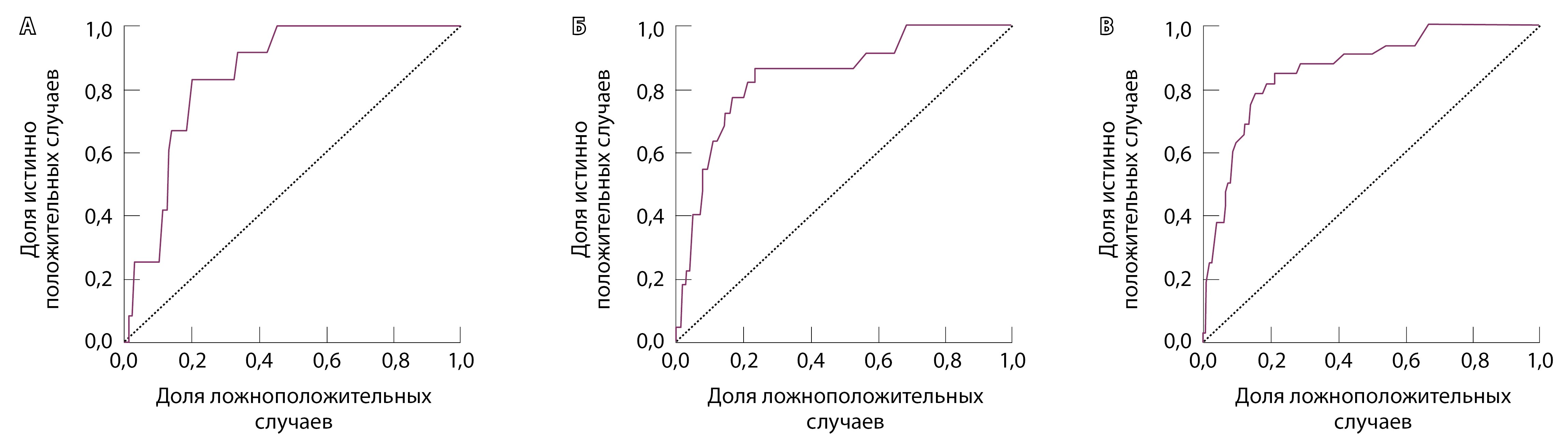 Рис. 2. Результаты ROC-анализа прогностической модели: А – развития фибрилляции предсердий (AUC = 0,85), Б – летального исхода (AUC = 0,84), В – комбини-рованной конечной точки (развитие фибрилляции предсердий и летального исхода, AUC = 0,86)