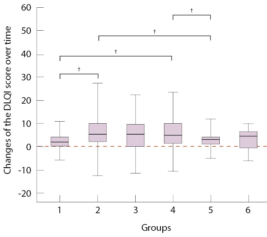 4. Fig. 3. Comparison of the changes over time in the Dermatology Life Quality Index (DLQI) score (the difference between pre- and post-SARS-CoV-2 values) between the groups according to the leading immune response pattern of the skin disease (Dunn’s test with Holmes-Bonferroni adjustment); the zero mark (red dotted line) means no changes in the IGA score; the difference between the groups is significant, † p < 0.001