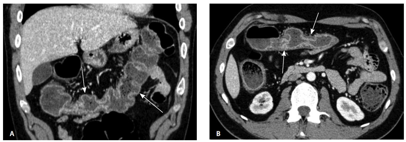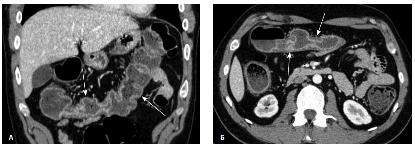 Рис. 1. Мультиспиральная компьютерная томография органов брюшной полости с внутривенным введением контрастного вещества (йомепрол 350–100 мл), артериальная фаза: А – фронтальная проекция, Б – аксиальная проекция. Стрелками указано диффузное утолщение стенки толстой кишки и брыжейки