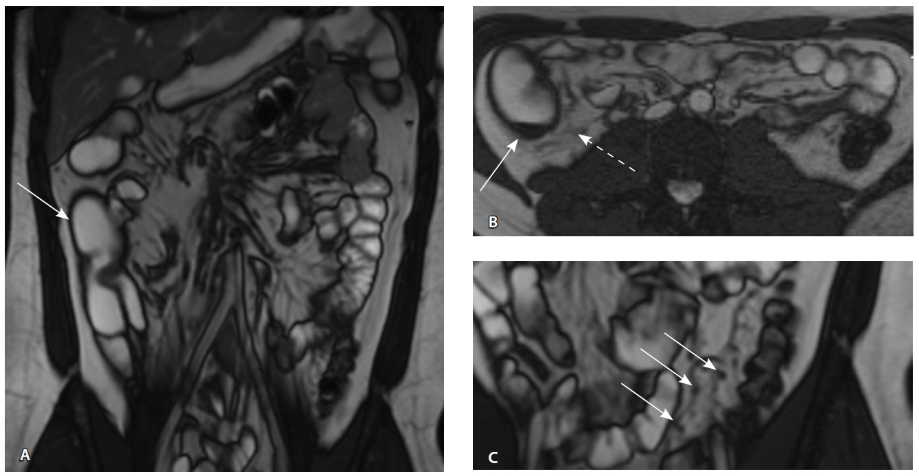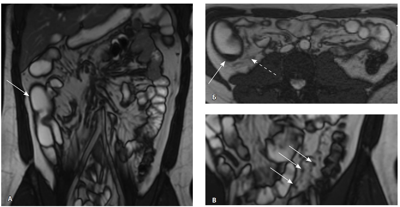 Рис. 2. Магнитно-резонансная энтерография, Т2-взвешенное изображение: А, В – фронтальная проекция; Б – аксиальная проекция. Наблюдается отсутствие гаустрации в восходящем отделе ободочной кишки, утолщение ее стенки до 5 мм (стрелка), снижение магнитно-резонансного сигнала от прилежащих отделов клетчатки, ее неоднородность (пунктирная стрелка), увеличение лимфатических узлов до 6 см в диаметре по ходу сигмовидной кишки (стрелки)