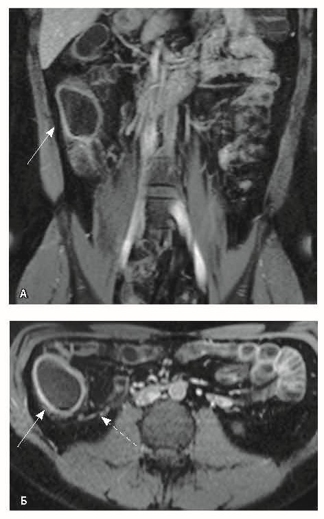 Рис. 3. Магнитно-резонансная энтерография, Т1-взвешенное изображение после внутривенного контрастного усиления (гадобутрол, 5 мл): А – фронтальная проекция, Б – аксиальная проекция. Наблюдается выраженное усиление интенсивности сигнала от восходящего отдела ободочной кишки (стрелка), усиление сигнала от окружающей клетчатки (пунктирная стрелка)