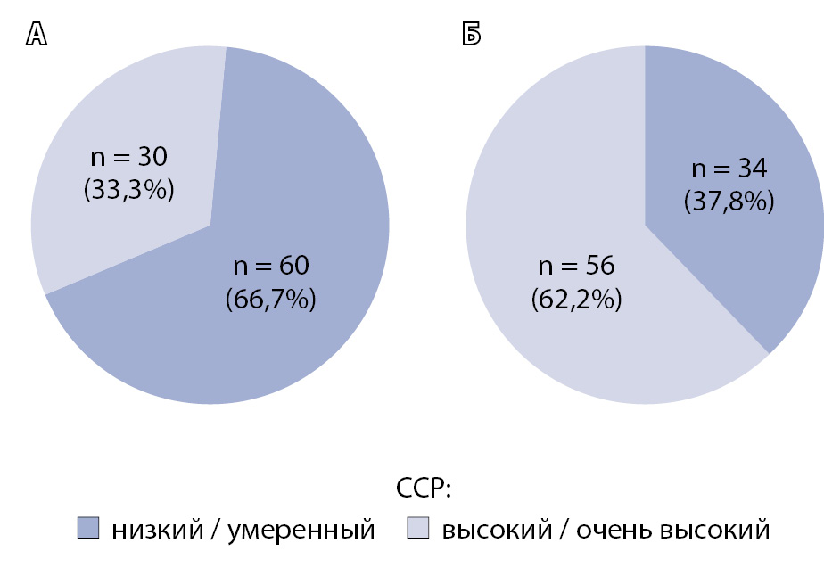 Достижение целевых уровней артериального давления (АД) и холестерина липопротеидов низкой плотности (ХС-ЛНП), а также категорию суммарного ССР оценивали в соответствии с Российскими национальными клиническими рекомендациями по кардиоваскулярной профилактике [11]. Помимо этого, проводили оценку ССР в соответствии с рекомендациями по кардиоонкологии ЕОК 2022 г. [6].