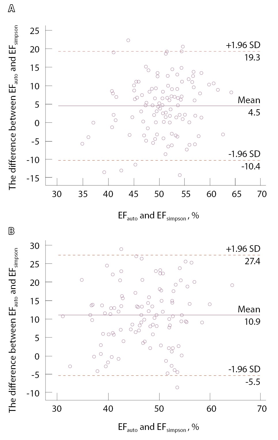 Статистическую обработку данных выполняли с помощью пакета программ SPSS v. 21.0 (SPSS Inc, США) и языка R (версия 4.3.1). Нормальность распределения данных оценивали по критерию Шапиро – Уилка. В случае нормального распределения данные представлены в виде среднего арифметического и стандартного отклонения (M ± SD), для скошенного распределения – как медиана и межквартильный размах (Me [Q25; Q75]). Сравнение ФВсимпсон и ФВавто осуществляли методом Бланда – Альтмана. Различия параметров на этапах исследования сравнивали, используя критерии Уилкоксона и Стьюдента при скошенном и правильном распределении соответственно. Корреляционные связи оценивали с помощью критериев Пирсона и Спирмена в зависимости от нормальности распределения. Различия считали значимыми при р < 0,05. Учитывая post-hoc характер исследования, расчет необходимого размера выборки не выполняли.