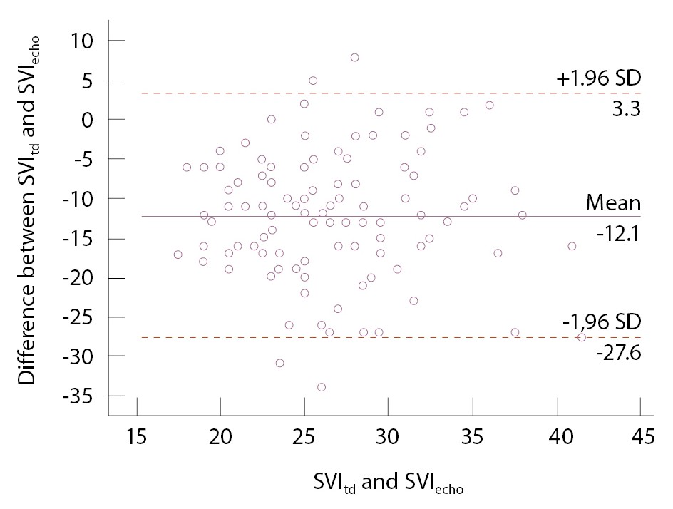 Разница в определении ИУО двумя методами, полученная нами, подтверждает результаты других авторов [12] и не позволяет считать эхокардиографическое определение УО достойной альтернативой термодилюции. Примечательно, что T. Bombardini и соавт. выделили несколько гемодинамических фенотипов у пациентов с ишемической болезнью сердца с различной степенью хронотропной несостоятельности, недостаточной преднагрузкой или контрактильным резервом на основании динамики ЧСС и объемов левого желудочка при стресс-эхокардиографии [27]. Подход может иметь потенциал и в периоперационном периоде АКШ, но данная стратификация требует точности в определении искомых показателей.