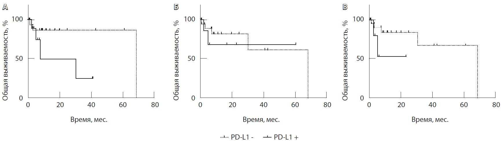 Рис. 2. Анализ прогностической значимости экспрессии PD-L1 в различных компонентах дедифференцированной хондросаркомы: общая выживаемость пациентов в зависимости от экспрессии PD-L1 в дедифференцированном (А), хондроидном (Б) и в обоих (В) компонентах опухоли. PD-L1 - – отсутствие экспрессии PD-L1, PD-L1 + – наличие экспрессии PD-L1