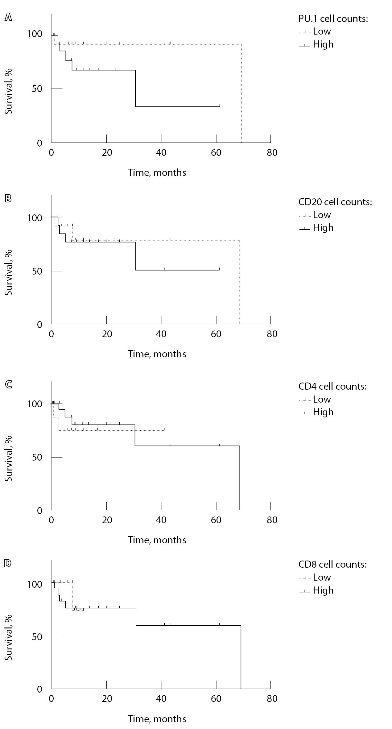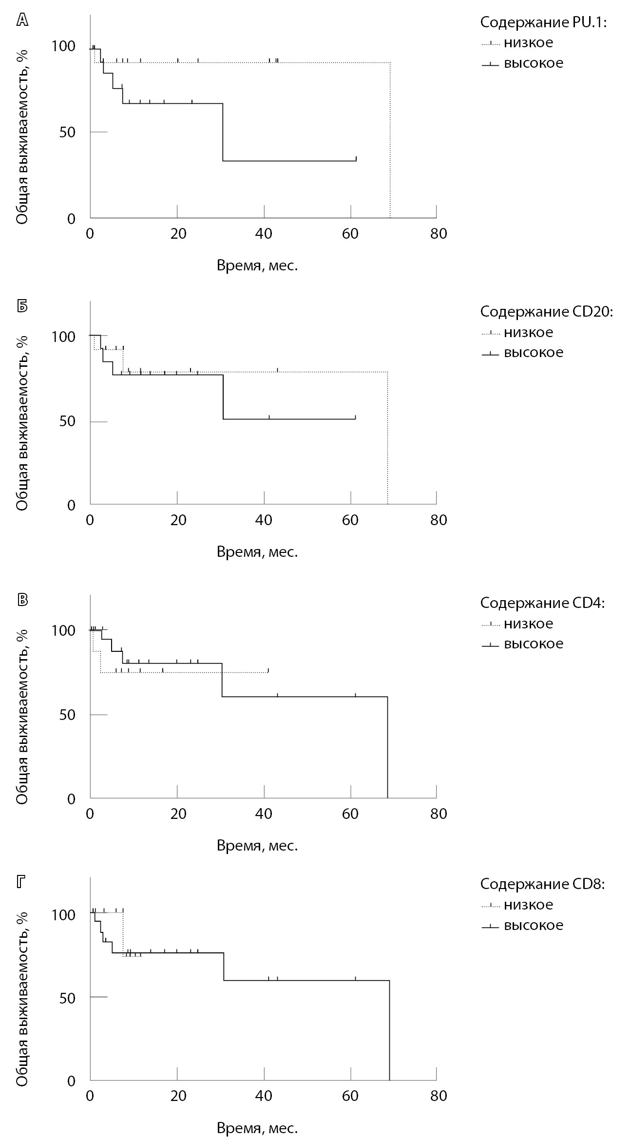 Рис. 4. Общая выживаемость пациентов с дедифференцированной хондросаркомой в зависимости от содержания макрофагов (А – PU.1), B-клеток (Б – CD20) и Т-клеток различных фенотипов (В – CD4, Г – CD8) в строме дедифференцированного компонента опухолей. Для анализа выживаемости группы сравнения были сформированы в зависимости от содержания иммунных клеток микроокружения выше или ниже среднего