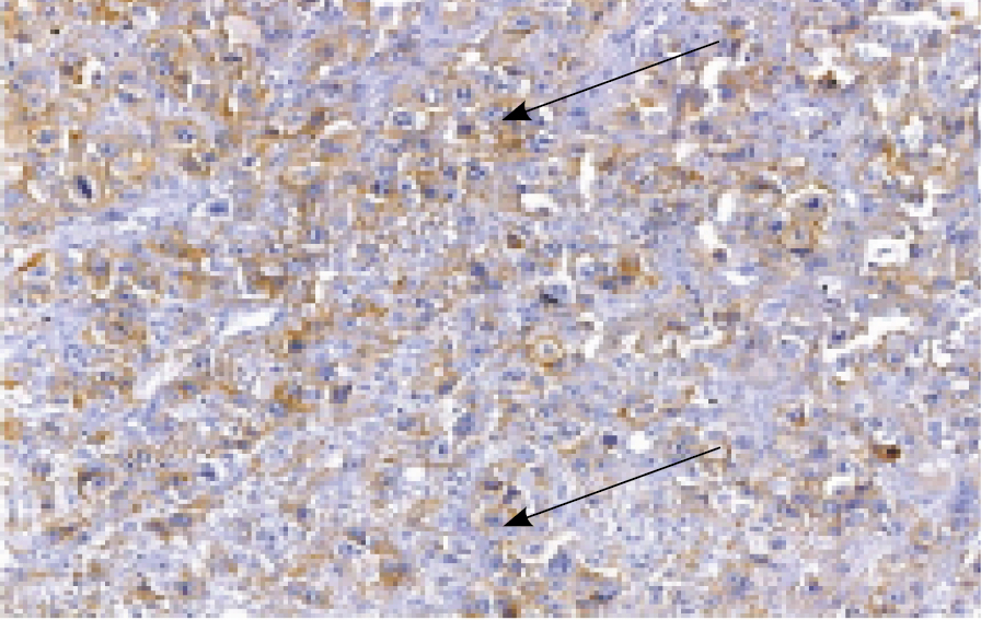 Рис. 1. Иммуногистохимический метод исследования. Положительная ядерно-цитоплазматическая экспрессия маркера PD-L1 в опухолевых клетках и опухоль-инфильтрирующих лимфоцитах в полиморфноклеточном саркоматозном образце дедифференцированной хондросаркомы (стрелки). Микропрепарат (×200)