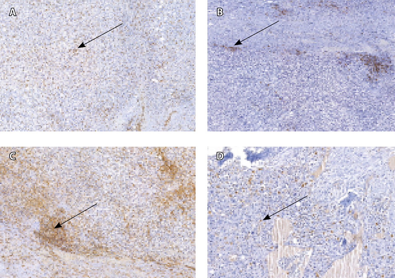 Рис. 3. Иммуногистохимический метод исследования. Экспрессия маркеров PU.1 (А), CD20 (Б), СD4 (В) и СD8 (Г) в опухоль-инфильтрирующих лимфоцитах в образцах ткани дедифференцированной хондросаркомы (стрелки). Микропрепарат (×100)