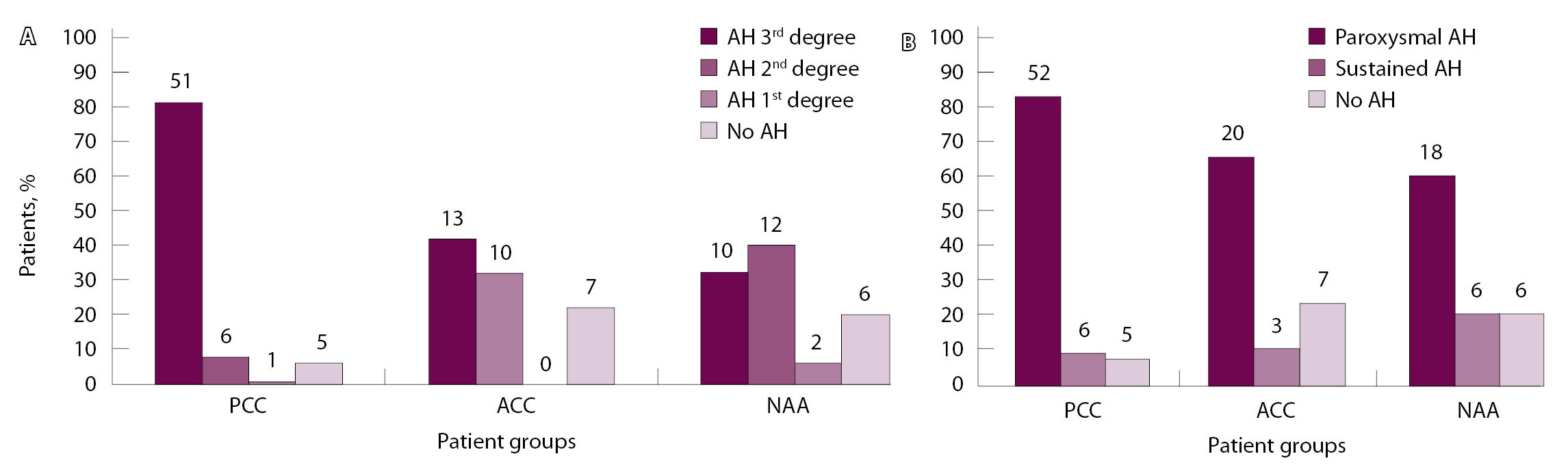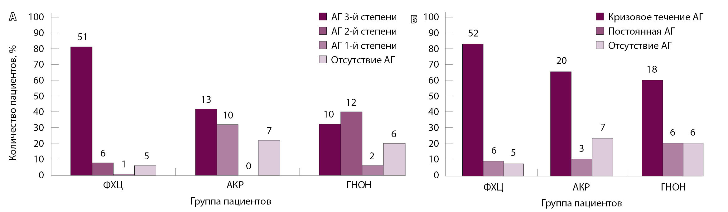 Рис. 3. Степень (А) и характер течения артериальной гипертензии (АГ, Б) в группах обследованных пациентов в зависимости от вида опухоли надпочечника. Над столбцами указано абсолютное количество пациентов. АКР – адренокортикальный рак, ГНОН – гормонально-неактивные опухоли надпочечников, ФХЦ – феохромоцитома
