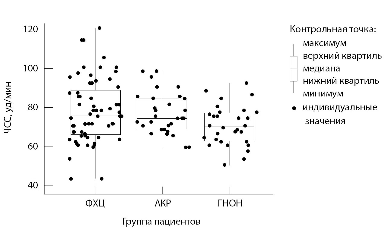 Рис. 4. Частота сердечных сокращений (ЧСС) у обследованных пациентов в зависимости от вида опухоли надпочечника. АКР – адренокортикальный рак, ГНОН – гормонально-неактивные опухоли надпочечников, ФХЦ – феохромоцитома