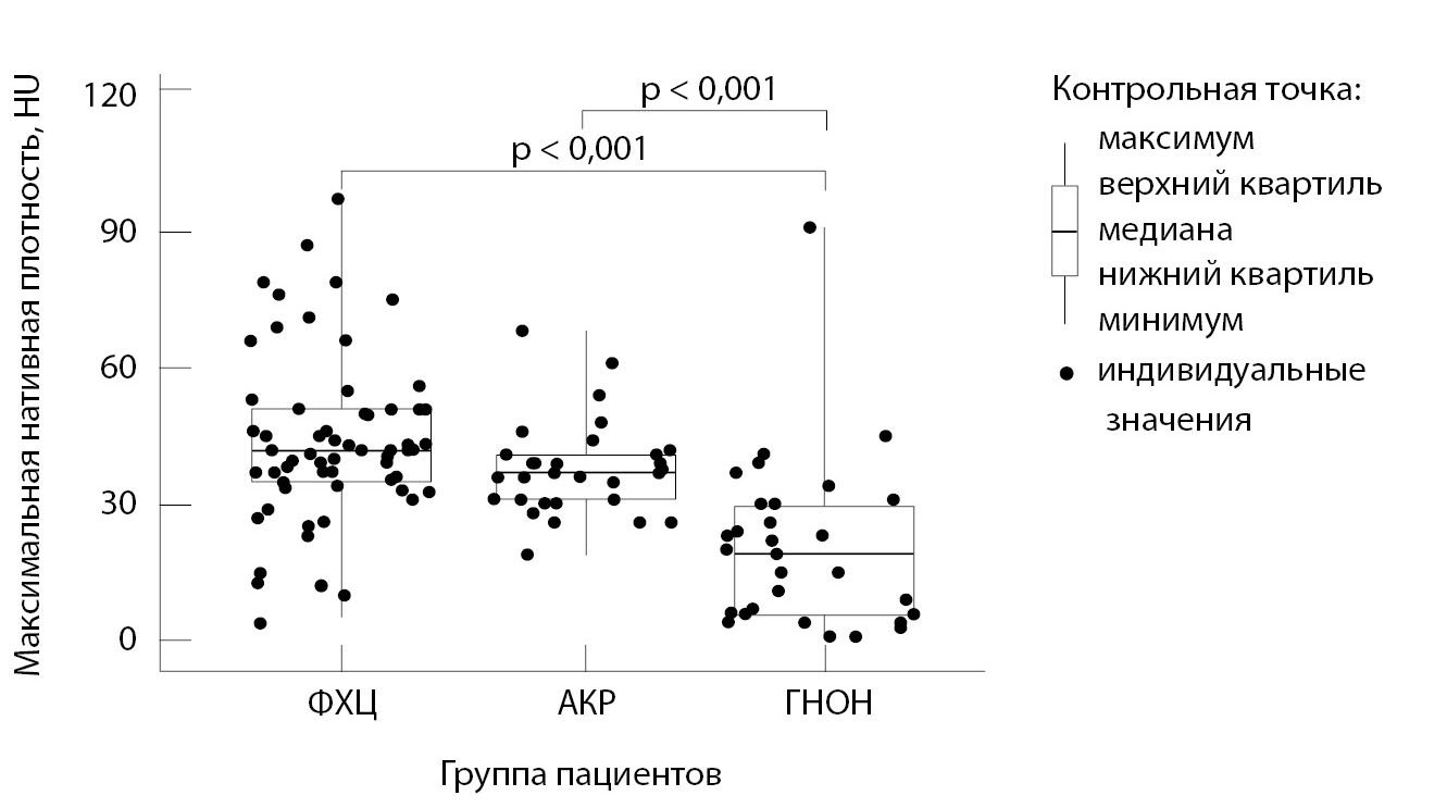 Рис. 7. Максимальная нативная плотность образования надпочечника по данным компьютерной томографии у обследованных пациентов в зависимости от вида опухоли. АКР – адренокортикальный рак, ГНОН – гормонально-неактивные опухоли надпочечников, ФХЦ – феохромоцитома