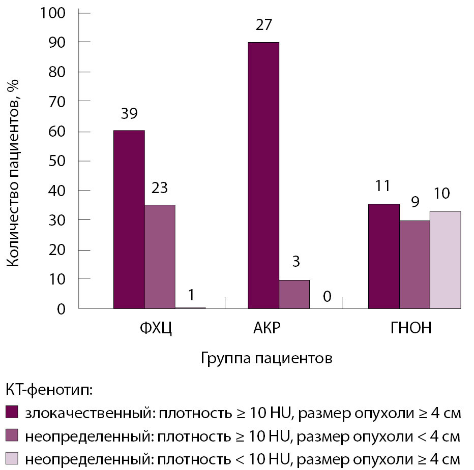 Пациенты были разделены на 3 группы исходя из верифицированного гистологического диагноза: ФХЦ (n = 63), АКР (n = 30), ГНОН (n = 30).