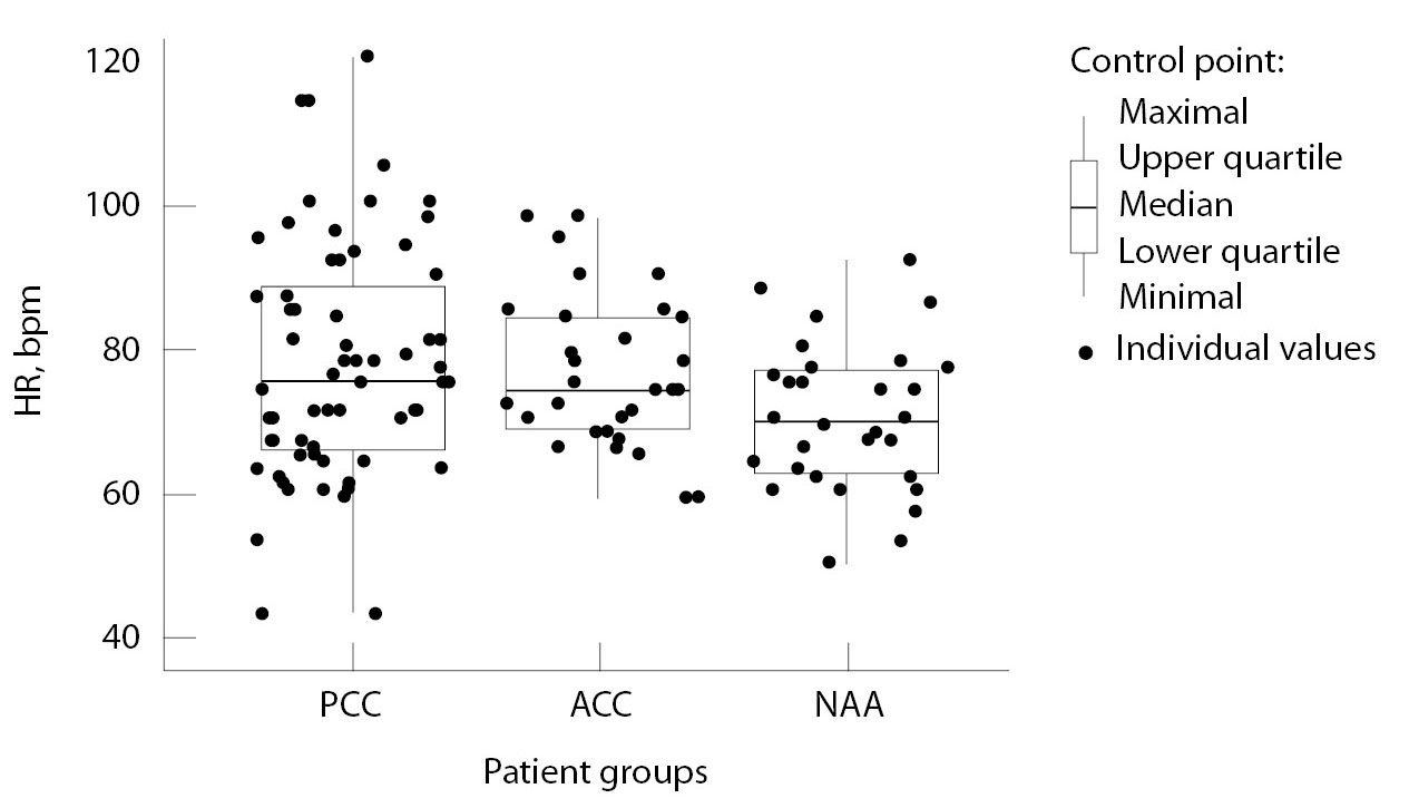 ЧСС не различалась между группами (р = 0,058) (рис. 4). Вместе с тем доля пациентов с ЧСС > 90 уд/мин, зафиксированной при осмотре и/или по данным электрокардиографии, отличалась при множественном сравнении (p = 0,016) и была выше в группе ФХЦ (15/63, 23,8%) по сравнению с группой ГНОН (1/30, 3%) (р = 0,016), но статистически значимо не отличалась по сравнению с группой АКР (р = 0,122). Ощущение учащенного сердцебиения (как субъективная жалоба, см. табл. 1) и тахикардия с ЧСС более 90 уд/мин одновременно фиксировались у 10 пациентов с ФХЦ, у 2 – с АКР и 2 – с ГНОН. Если суммировать эти проявления, их превалирование в группе ФХЦ становится более очевидным (рис. 5).