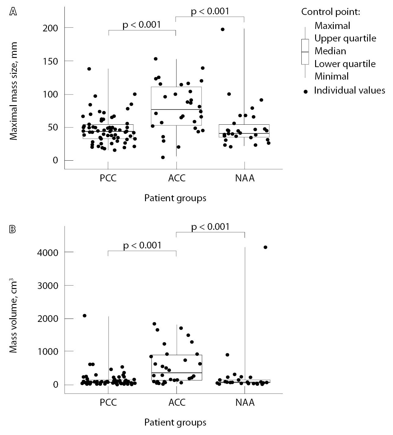Рис. 6. Максимальные размеры (А) и объемы образований надпочечника (Б) в группах обследованных пациентов в зависимости от вида опухоли надпочечника. АКР – адренокортикальный рак, ГНОН – гормонально-неактивные опухоли надпочечников, ФХЦ – феохромоцитома