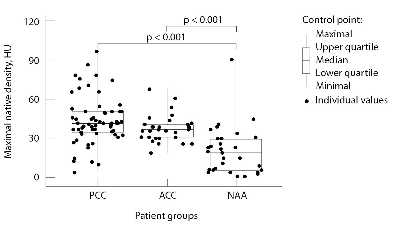 Показатели размера и объема опухоли надпочечника, а также нативной плотности имели статистически значимые отличия при множественном сравнении (р < 0,001 для всех КТ-признаков). При попарном сравнении размер и объем опухоли надпочечника были статистически значимо больше в группе АКР по сравнению с группами ФХЦ и ГНОН (р < 0,001 при критическом уровне значимости < 0,0167 для обоих сравнений), однако не отличались в группах ФХЦ и ГНОН (рис. 7). Показатели нативной плотности образований надпочечников были статистически значимо выше при ФХЦ и АКР по сравнению с ГНОН (р < 0,001 при критическом уровне значимости < 0,0167 для обоих сравнений). При сравнении нативной плотности ФХЦ и АКР статистически значимых различий не обнаружено (рис. 8).