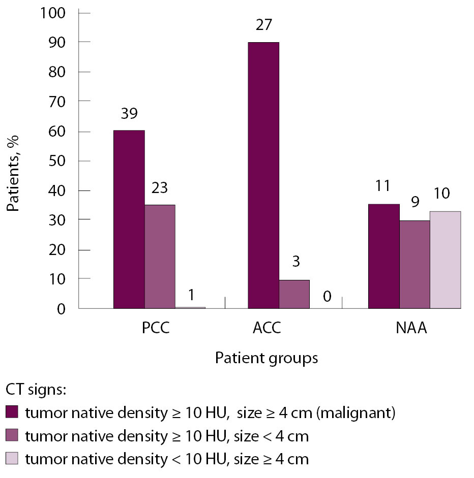 Conclusion: In adrenal tumors of the malignant CT phenotype, the differential diagnosis should be made between ACC and PCC, while the presence of NAA is highly unlikely. In tumors with native density of > 10 HU and tumor size of < 4 cm, the differential diagnosis should first consider PCC and NAA, while the chance to identify ACC is low. The adrenal masses with the native density of < 10 HU and tumor size of ≥ 4 cm were strongly suggestive of benign NAA, with an exceedingly low risk of cancer.