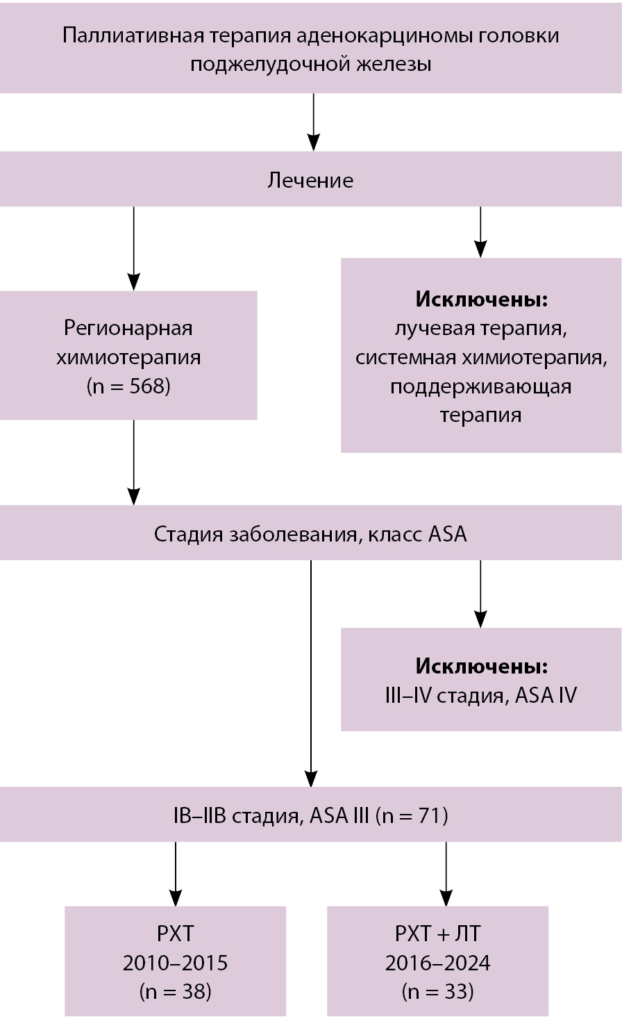 С 2010 по 2024 г. в ФГБУ «РНЦРХТ им. ак. А.М. Гранова» Минздрава России паллиативную РХТ провели 568 больным РПЖ. В ретроспективный анализ включали данные пациентов с резектабельной протоковой аденокарциномой головки поджелудочной железы, физический статус которых по классификации Американского общества анестезиологов (англ. American Society of Anesthesiologist, ASA) был оценен как ASA III (пациенты с тяжелым системным заболеванием, неоперабельные) и которым была проведена РХТ в монорежиме либо в комбинации с конформной ЛТ. Катамнез отслежен по состоянию на 01.02.2025.