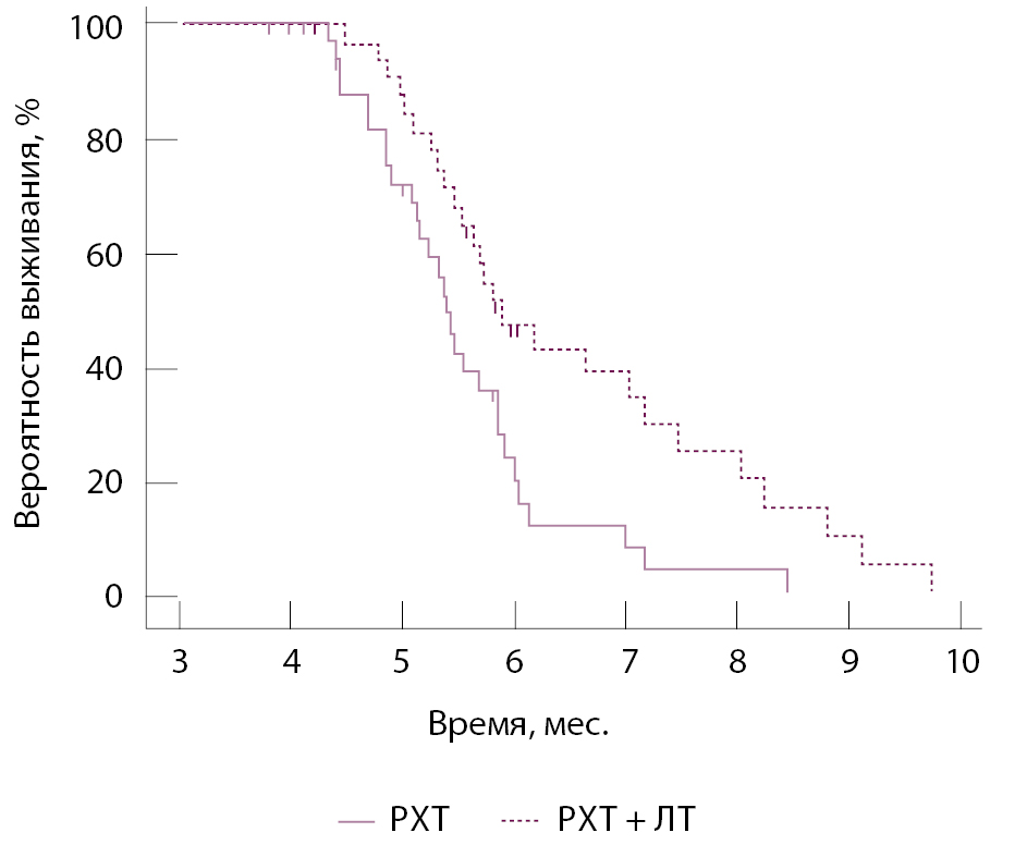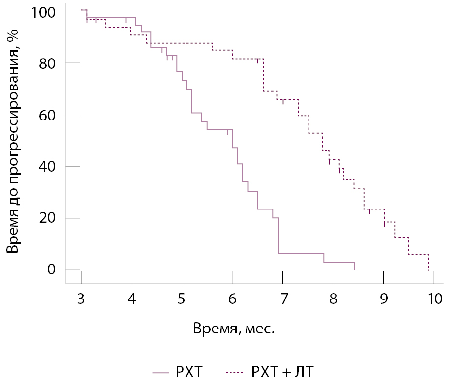 Рис. 4. Время до прогрессирования (метод Каплана – Мейера) в группах проведения регионарной химиотерапии в монорежиме (РХТ) и в комбинации с дистанционной лучевой терапией в режиме дневного дробления дозы (РХТ + ЛТ)