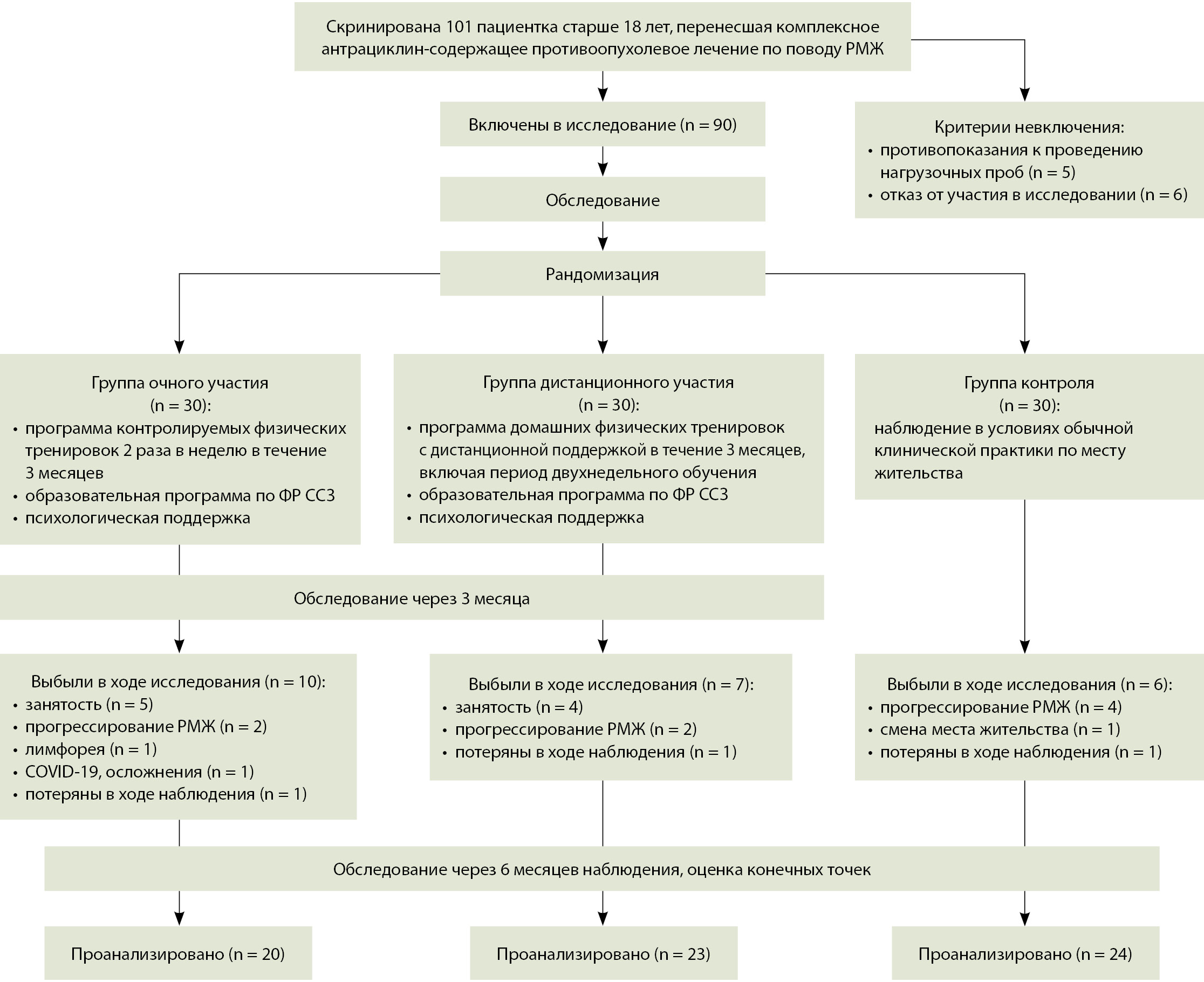 Проведено пилотное одноцентровое рандомизированное проспективное исследование. Обследовано 90 пациенток в возрасте 18 лет и старше, перенесших комплексное ПОЛ по поводу РМЖ, включавшее антрациклин-содержащую химиотерапию (ХТ), оперативное лечение в сочетании с лучевой, таргетной или гормональной терапией или без таковой согласно действующим рекомендациям. Пациентки были направлены или самостоятельно обратились в ФГБУ «Национальный медицинский исследовательский центр кардиологии имени академика Е.И. Чазова» Минздрава России (ФГБУ «НМИЦК им. ак. Е.И. Чазова» Минздрава России) в 2021–2023 гг. для обследования и определения тактики кардиологического ведения после завершения кардиотоксичного ПОЛ. Критериями невключения в исследование были абсолютные противопоказания к проведению нагрузочных проб. Проведение исследования одобрено независимым этическим комитетом ФГБУ «НМИЦК им. ак. Е.И. Чазова» Минздрава России (протокол № 269 от 28.06.2021). Все пациентки подписали добровольное информированное согласие на участие в исследовании.