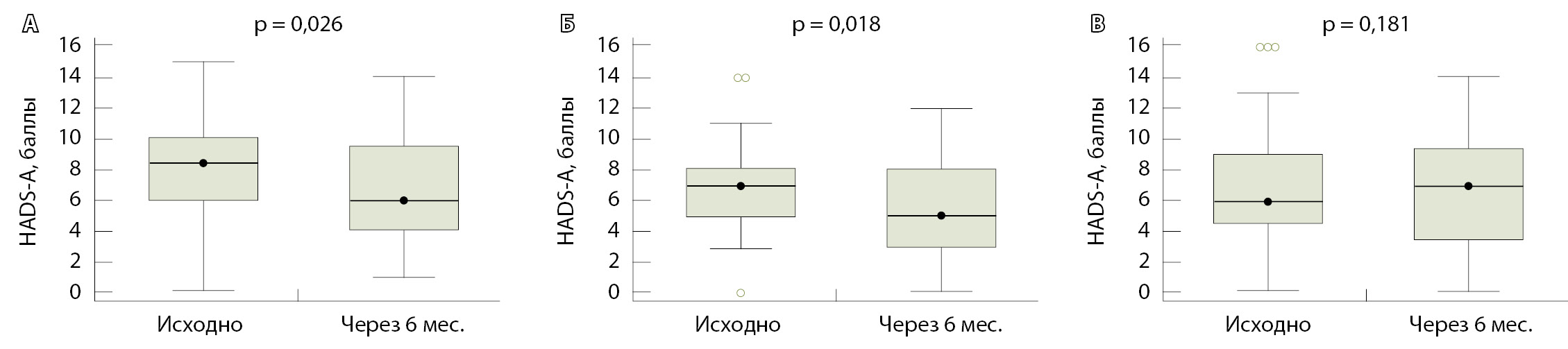 4. Fig. 3. Changes over time in anxiety symptoms (AS) in the patients with baseline subclinical and clinically overt AS in the off-line group (n = 13) (А), online group (n = 11) (B) and control group (n = 10) (C)