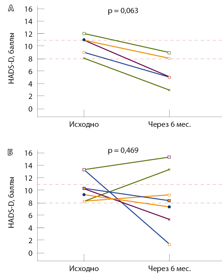 5. Fig. 4. Changes over time in depressive symptoms (DS) in the patients with baseline subclinical and clinically overt DS in the merged group of cardio-oncology rehabilitation (n = 5) (А) and the control group (n = 7) (B). The dotted lines show the thresholds for subclinical (8 points) and clinically overt (11 points) DS. HADS, Hospital Scale of Anxiety and Depression