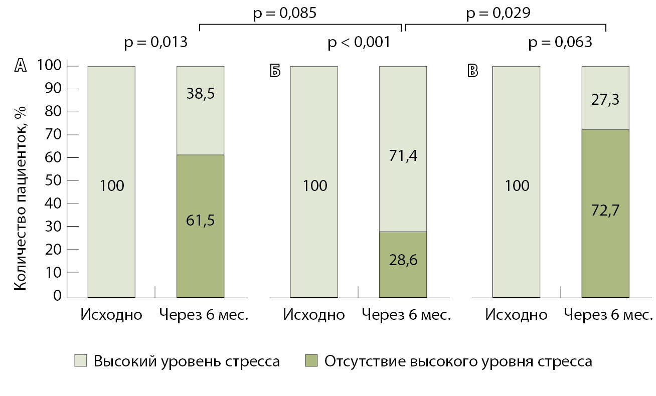 7. Fig. 6. Changes over time in stress levels in the patients with its high baseline scores in the off-line group (n = 13) (А), online group (n = 14) (B) and control group (n = 11) (C)