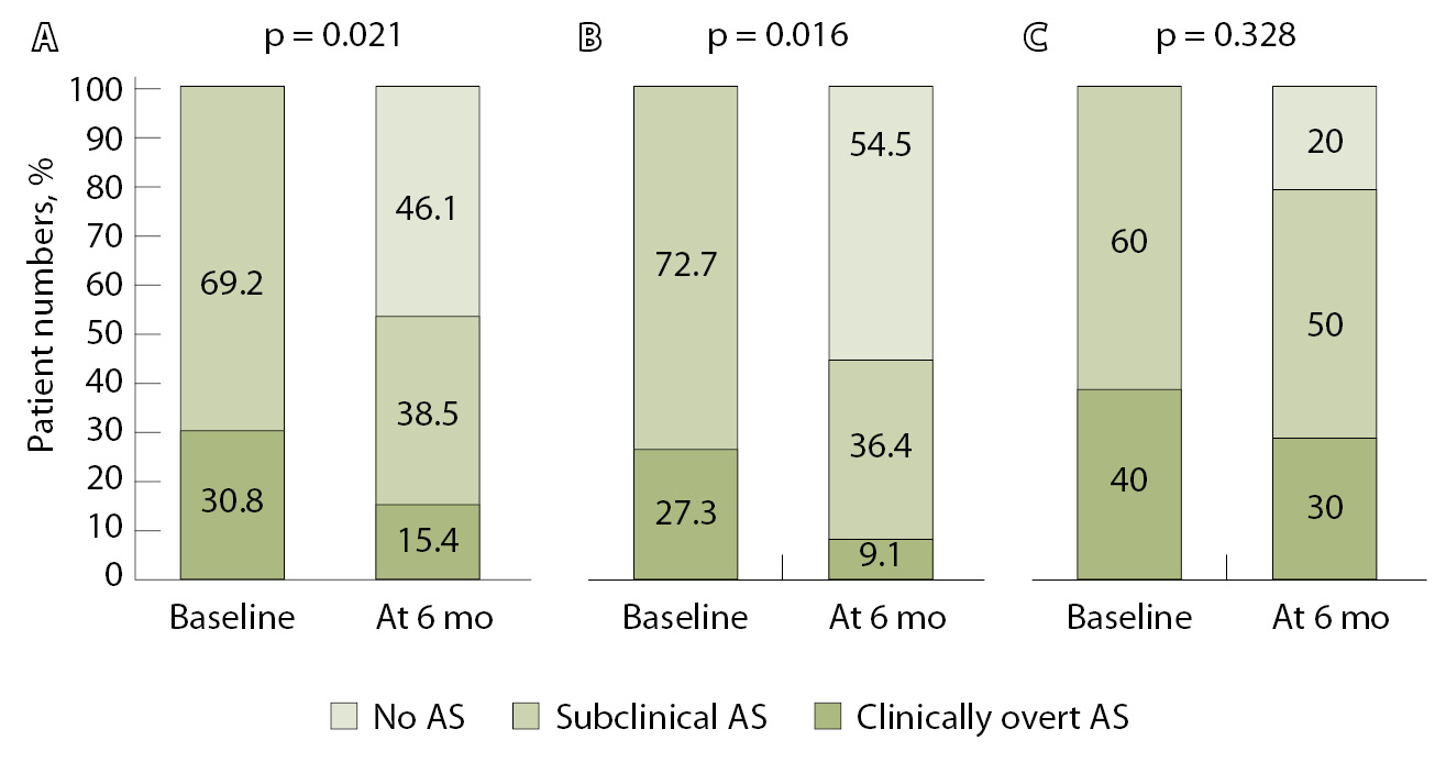 клинически выраженная | 18 (20,0) | 6 (20,0) | 4 (13,3) | 8 (26,7) | 0,435 |