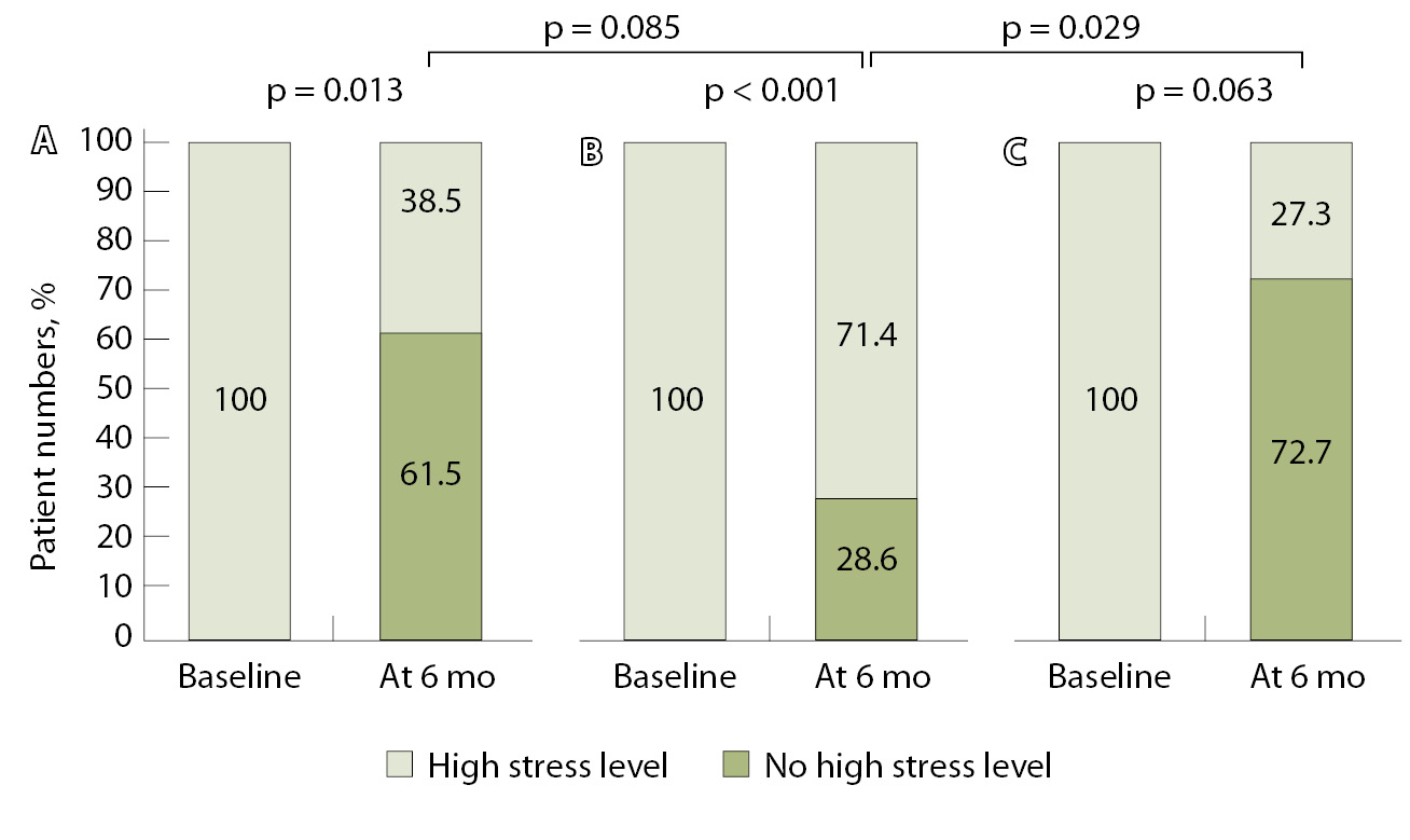Высокий уровень стресса, n (%) | 51 (56,7) | 18 (60,0) | 18 (60,0) | 15 (50,0) | 0,603 |