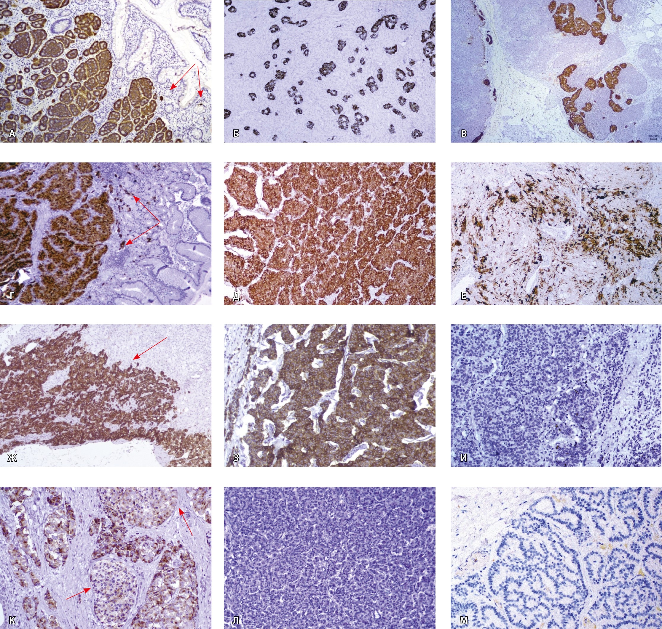 Рис. 1. Интенсивная цитоплазматическая экспрессия Oct4 (3+) в серотонин-продуцирующей нейроэндокринной опухоли (НЭО) подвздошной кишки Grade 1 (А, увеличение ×125), метастазах в яичнике (Б, увеличение ×125) и лимфатическом узле шеи (В, увеличение ×40). Интенсивная экспрессия Oct4 (3+) в высокодифференцированной НЭО желудка и в эндокринных клетках окружающей слизистой (показано стрелками) (Г, увеличение ×125). Интенсивная экспрессия Oct4 (3+) в феохромоцитоме с низким потенциалом метастазирования (Д, увеличение ×125) и в клетках медуллярного слоя надпочечников (Ж, увеличение ×125), неравномерная экспрессия Oct4 с наличием больших полей, где экспрессия очаговая или отсуствует, в феохромоцитоме с высоким метастатическим потенциалом (Е, увеличение ×125). Интенсивная экспрессия Oct4 (3+) в клетках атипичного карциноида легкого (З, увеличение ×250). Негативная реакция с Oct4 в клетках типичного карциноида легкого (И, увеличение ×125). Умеренно выраженная неравномерная экспрессия Oct4 (2+) в клетках инсулиномы поджелудочной железы и слабая очаговая экспрессия (1+) в клетках эндокринного островка (показано стрелками) (К, увеличение ×250). Негативная реакция в клетках нефункционирующей глюкагон-продуцирующей НЭО поджелудочной железы (Л, увеличение ×125) и в высокодифференцированной НЭО прямой кишки (М, увеличение ×125)