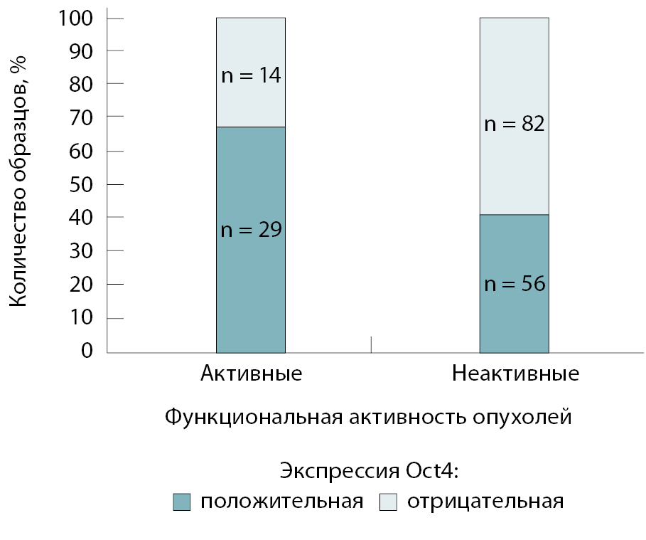 Несмотря на то что эндокринные гранулы – очень важные органеллы в нормальных эндокринных клетках и клетках НЭО, отличия в механизмах формирования гранул разных типов и депонирования в них широкого спектра гормонов до конца не изучены. Известно, что субстратом для эндокринных гранул служат молекулы, связанные с хромогранинами и секретогранинами, а некоторые из них участвуют и в сортировке, и в протеолитической обработке прогормонов [20]. Пока не ясно, какую именно функцию выполняет Oct4 в эндокринных гранулах, но на основании полученных нами данных становится очевидным, что максимально интенсивная экспрессия этого фактора в цитоплазме клеток высокодифференцированных НЭО непосредственно связана с формированием в них многочисленных эндокринных гранул, способных, как и их нормальные аналоги, накапливать и депонировать гормональные продукты определенных типов (серотонин, катехоламины, гистамин и их аналоги): экспрессия Oct4 значительно чаще встречалась в функционально активных НЭО (ОШ 3,03, 95% ДИ 1,47–6,25; р = 0,003), то есть в опухолях с сохраненными свойствами гормонального синтеза и секреции. Возможно, интенсивная экспрессия Oct4 отражает участие этого фактора в механизмах клеточной дифференцировки, формирования и стабилизации в них эндокринных гранул. В НЭО, в которых цитоплазматическая экспрессия Oct4 слабая или вообще отсутствует, формирование эндокринных гранул, вероятно, происходит по Oct4-независимым механизмам. Таким образом, цитоплазматическая экспрессия Oct4 представляет собой очень специфичный признак хорошо гранулированных высокодифференцированных НЭО, продуцирующих определенный спектр гормонов.
