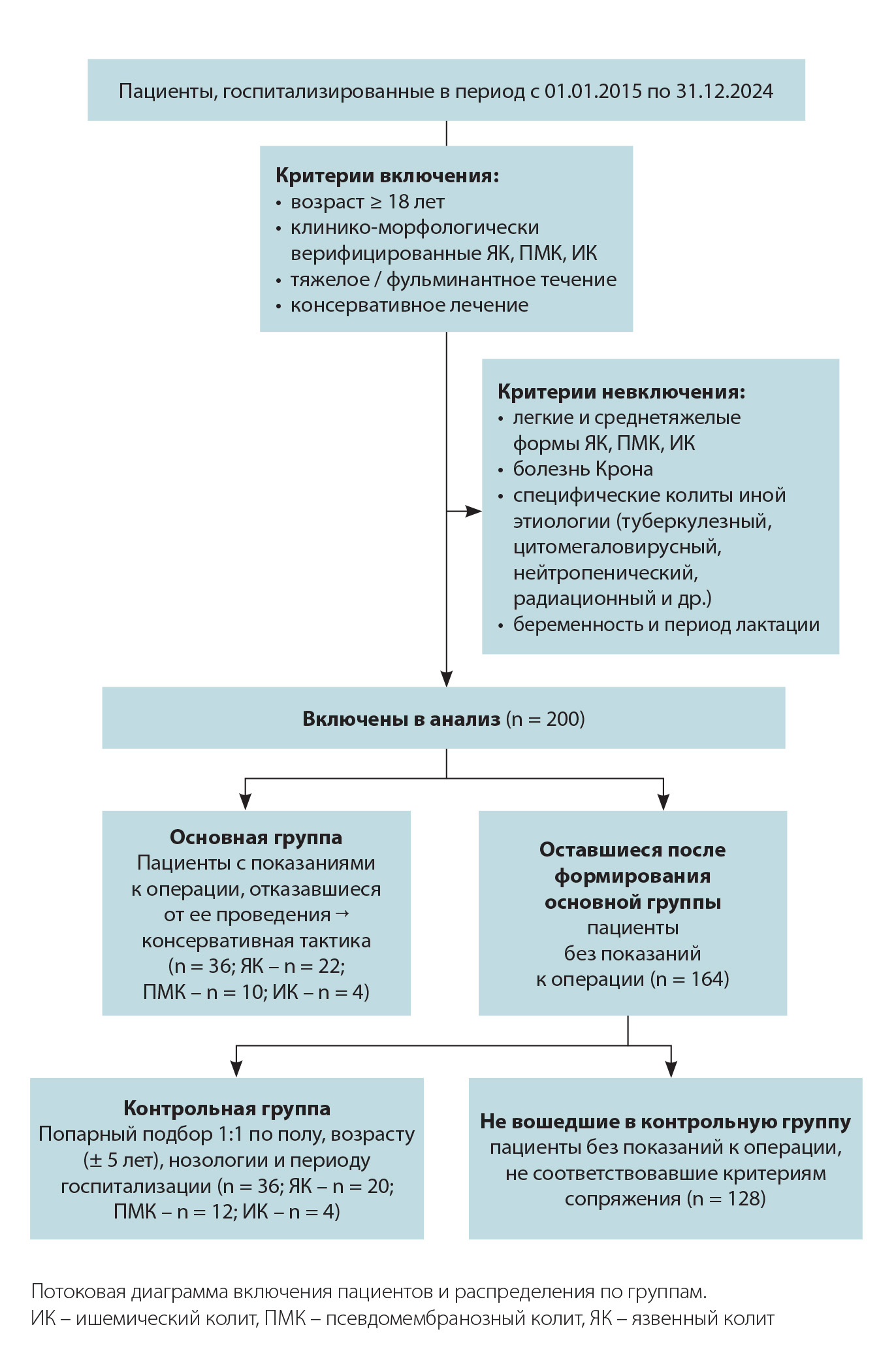 Формирование групп. После применения критериев включения и невключения была сформирована исходная когорта, которая состояла из 200 пациентов с тяжелыми и фульминантными формами ЯК, ПМК и ИК.
