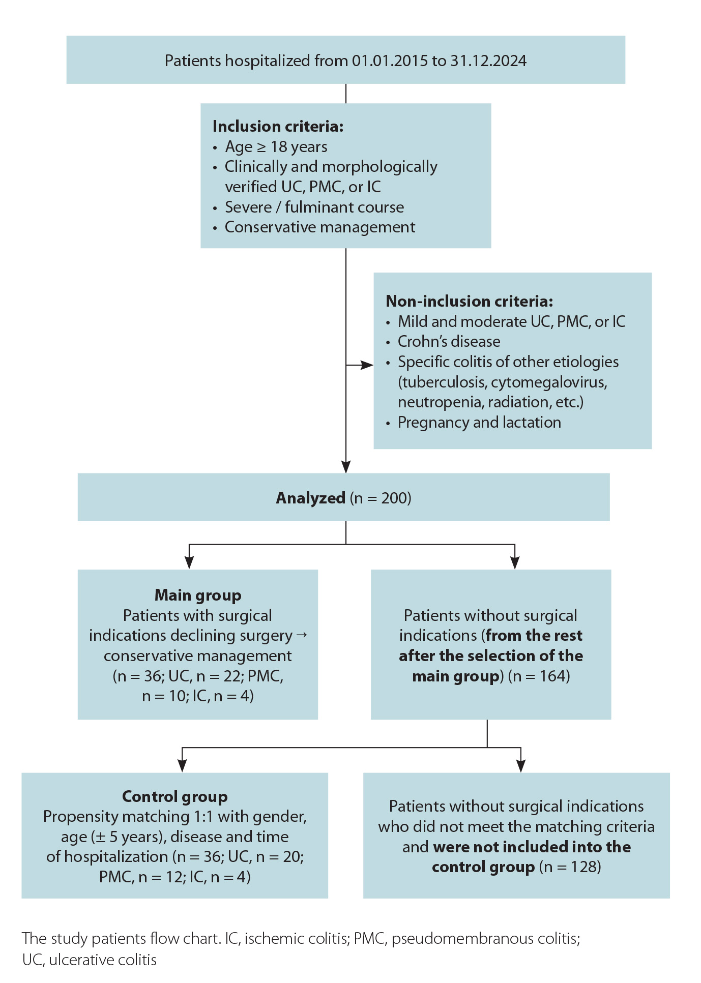 Критерии включения. В исследование включали пациентов старше 18 лет с клинически и морфологически верифицированными диагнозами ЯК, ПМК и ИК тяжелого или фульминантного течения, получавших консервативную терапию.