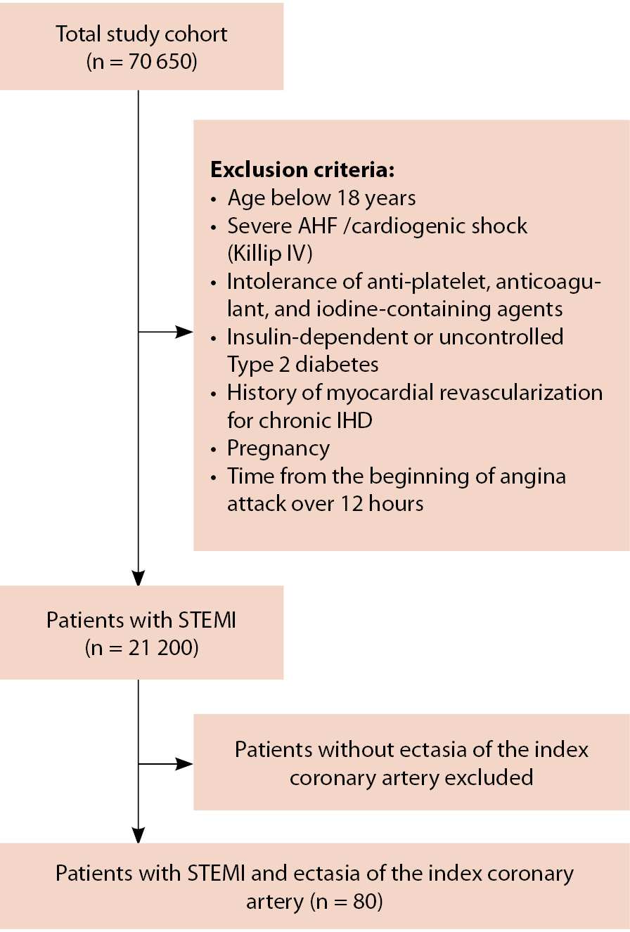 Критерии соответствия. Критериями включения в исследование были возраст пациента 18 лет и более, острый (первичный) ИМпST в бассейне эктазированной инфаркт-ответственной артерии, дебют ангинозного статуса у пациента не более 12 часов, наличие письменного информированного согласия на проведение КАГ. В исследование не включали пациентов с перенесенным ранее ИМ, реваскуляризацией миокарда по причине хронической ИБС в анамнезе, кардиогенным шоком (класс IV по классификации Killip), непереносимостью дезагрегантной, антикоагулянтной терапии и йодсодержащих контрастных препаратов, беременных. Из исследования исключали пациентов с инсулинозависимым сахарным диабетом, а также с декомпенсированным сахарным диабетом 2-го типа в остром периоде при госпитализации, когда уровень гликемии, наличие кетоза или потребность в интенсивной инсулинотерапии могли существенно влиять на течение острого ИМ (ОИМ) и интерпретацию результатов.