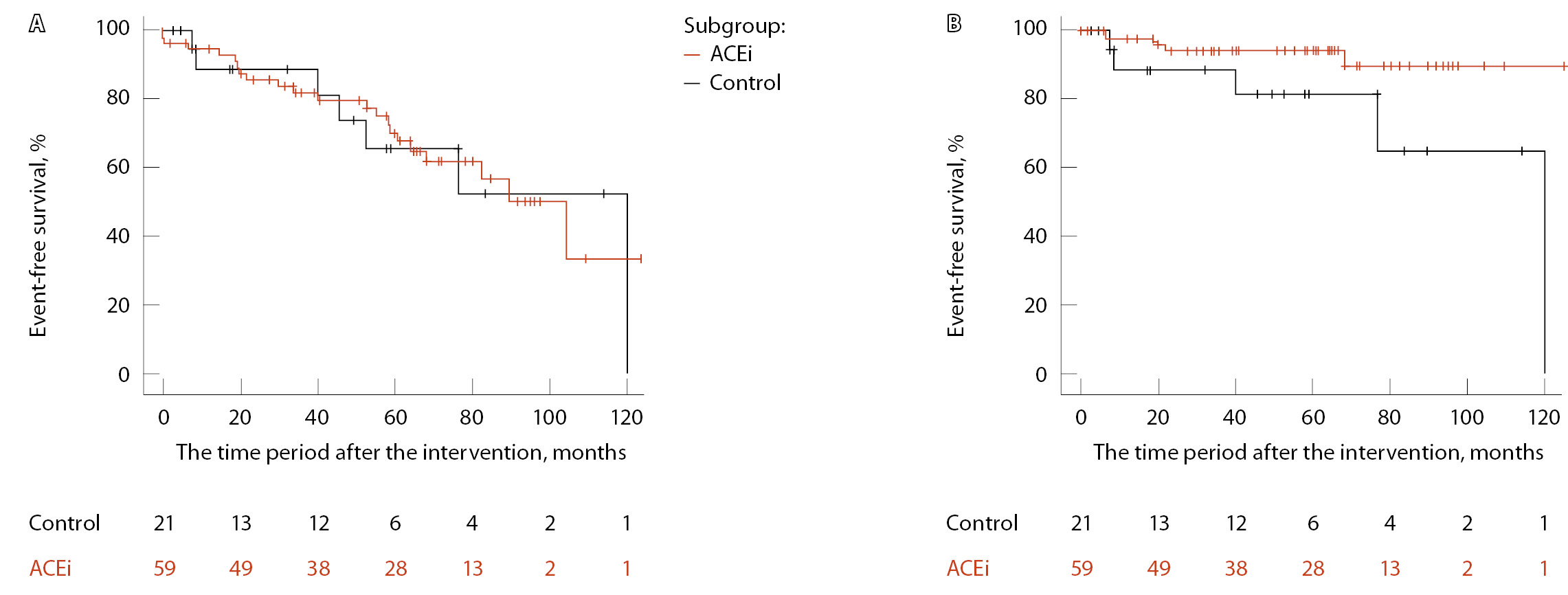 Рис. 2. Бессобытийная выживаемость, оцененная методом Каплана – Мейера (А – неблагоприятные сердечно-сосудистые события (MACE), Б – госпитализация по поводу хронической сердечной недостаточности), в подгруппе пациентов, получавших ингибиторы ангиотензинпревращающего фермента (иАПФ), в сравнении с контролем