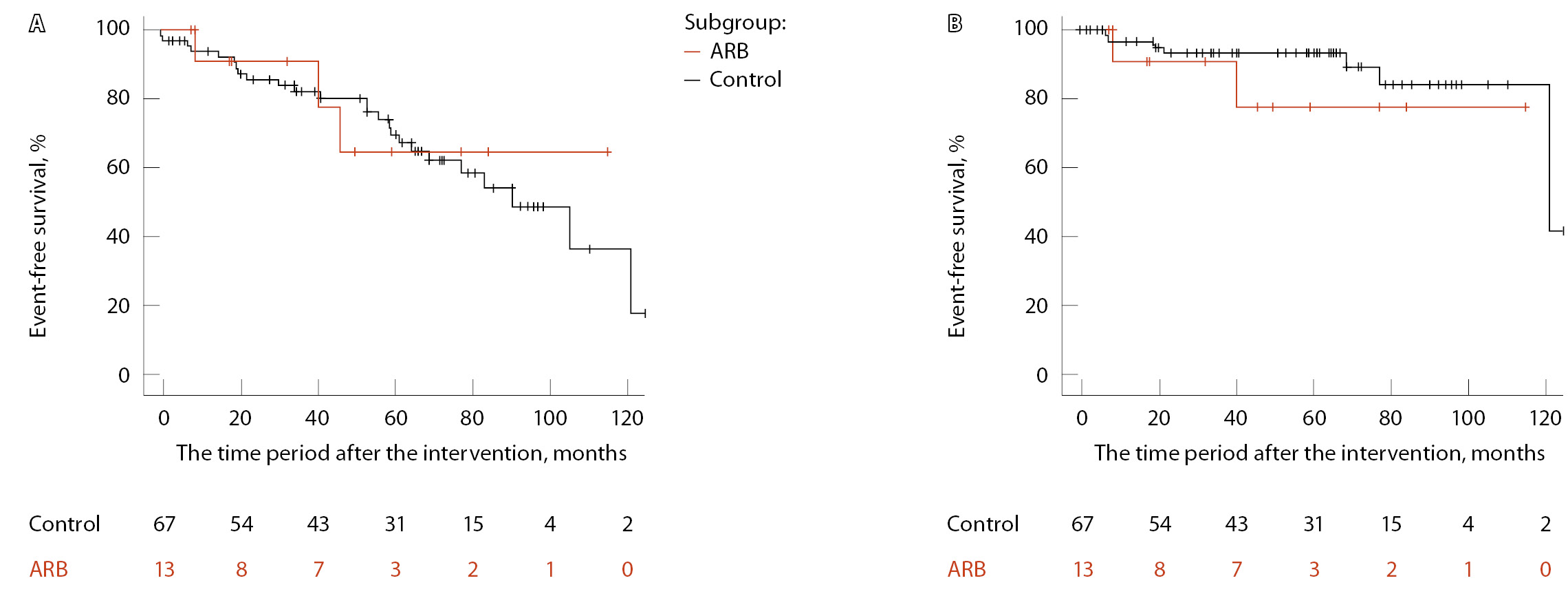 Рис. 4. Бессобытийная выживаемость, оцененная методом Каплана – Мейера (А – неблагоприятные сердечно-сосудистые события (MACE), Б – госпитализация по поводу хронической сердечной недостаточности), в подгруппе пациентов, получавших блокаторы кальциевых каналов (БКК), в сравнении с контролем