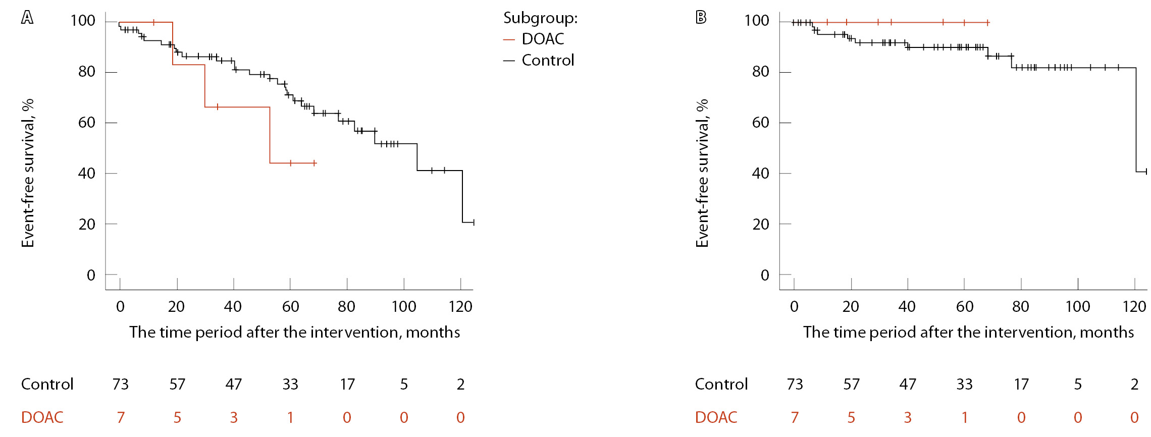 Рис. 5. Бессобытийная выживаемость, оцененная методом Каплана – Мейера (А – неблагоприятные сердечно-сосудистые события (MACE), Б – госпитализация по поводу хронической сердечной недостаточности), в подгруппе пациентов, получавших прямые оральные антикоагулянты (ПОАК), в сравнении с контролем
