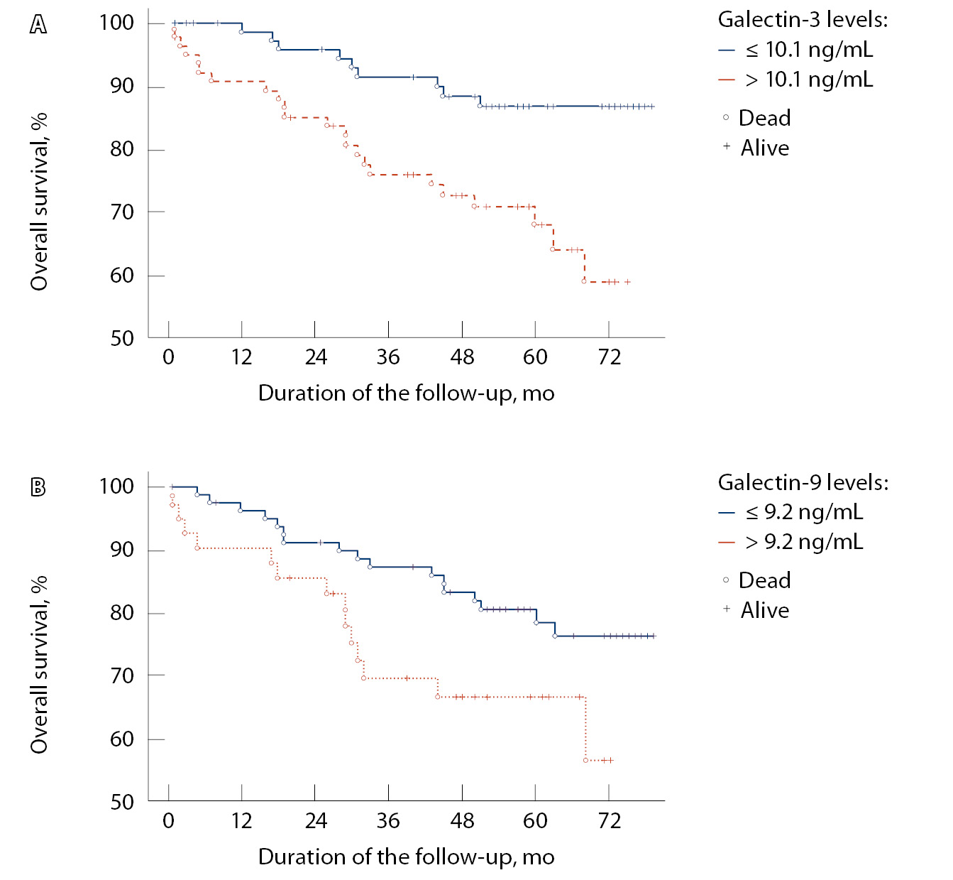 Рис. 1. Общая выживаемость больных почечно-клеточным раком с учетом медианы содержания галектина-3 (А) и галектина-9 (Б) в сыворотке крови
