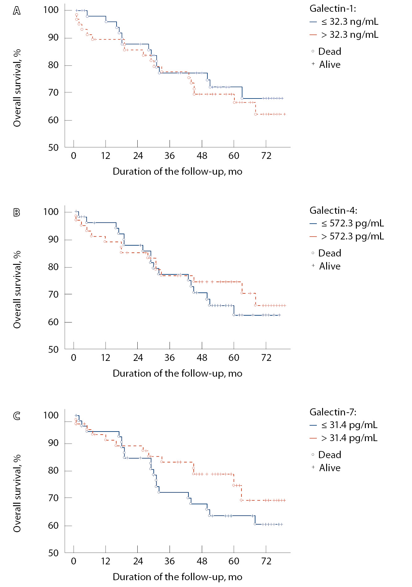 Уровни галектинов 1, 4, 7 не были ассоциированы с прогнозом общей выживаемости больных ПКР (рис. 2). Для галектинов 4 (рис. 2Б) и 7 (рис. 2В) можно даже отметить противоположную тенденцию: общая выживаемость больных ПКР несколько лучше при повышенных уровнях этих маркеров.