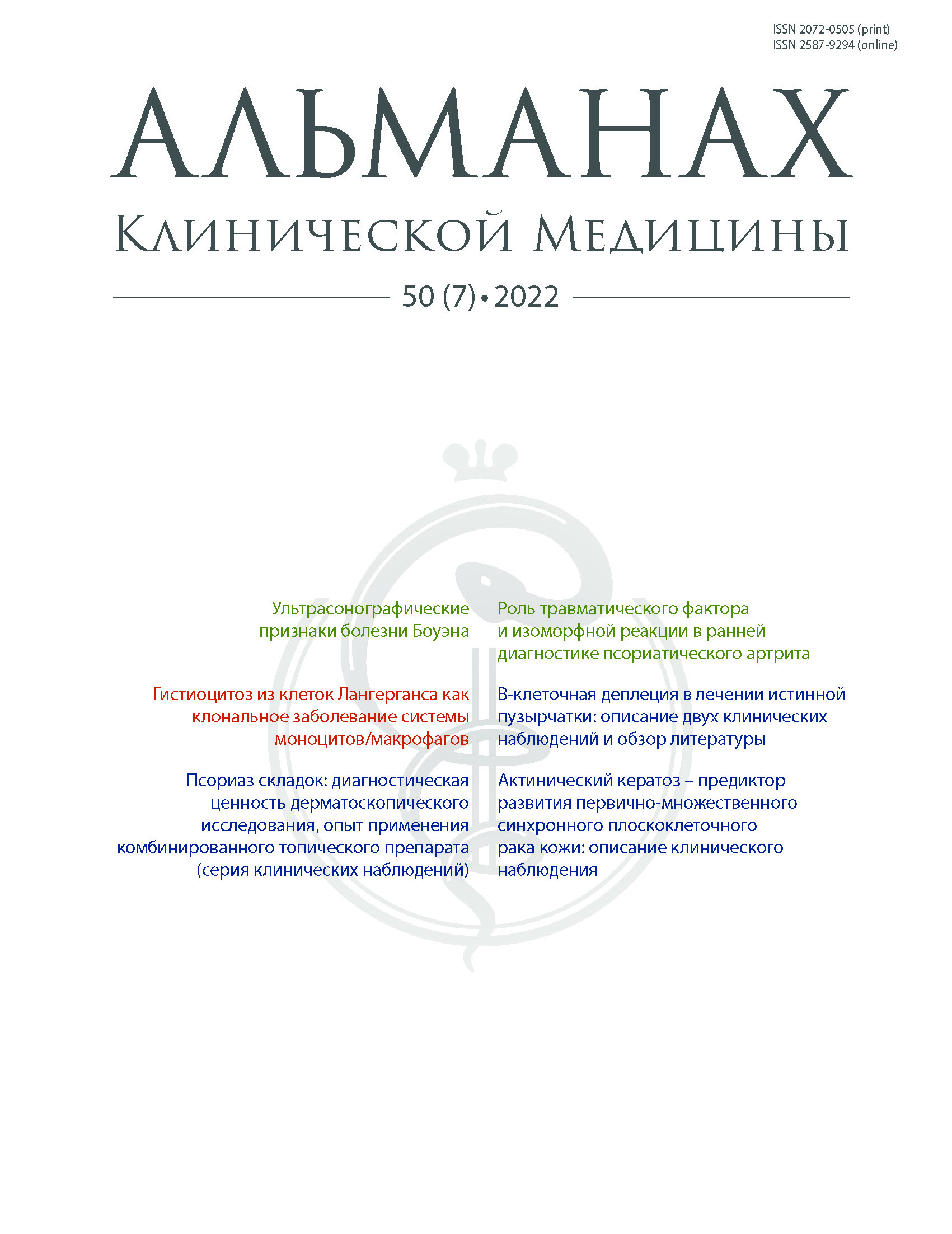 Conclusion: Dermatoscopy has proved to be a useful tool for non-invasive diagnostics of inverse psoriasis. At low magnification (× 20), its main sign was an even distribution of dotted vessels throughout the visualized area. In a number of cases, the dermatoscopic symptoms additionally included white scales grouped as isolated foci. The addition of the combination topical agent (mometasone furoate, gentamicin sulfate, econazole nitrate, and dexpanthenol) to the standard systemic therapy facilitated almost full resolution of skinfold psoriatic lesions.