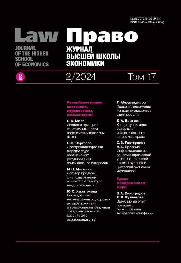 Вендинг-бизнес рассматривается как вид инновационной предпринимательской деятельности. Эта сфера включает несколько групп отношений между производителем вендинговых автоматов и покупателем автоматов; собственником автоматов и оператором, осуществляющим их использование; оператором и юридическим лицом по размещению автоматов; оператором и юридическим лицом по закупке товаров для реализации, закупке материалов для выполнения работы, оказания услуги посредством автоматов; оператором и юридическим лицом по ремонту автоматов; оператором и потребителем в купле-продаже, мене товаров, выполнении работ, оказании услуг, временном пользовании имуществом; оператором фандомата как покупателем использованной тары и гражданином-продавцом; собственником вендинговых автоматов (производителем, оператором) и третьим лицом (не стороной договора) в роли нарушителя или потерпевшего; между операторами, а также между каждым оператором и саморегулируемой организацией в этой области. Предлагается расширить область применения вендинга, включив в нее помимо купли-продажи обмен, временное пользование, оказание услуг, выполнение работ, пожертвование. Центральный договор розничной купли-продажи характеризуется в статье как соглашение, в силу которого продавец (оператор) без присутствия с использованием вендинг-автомата обязуется передать в собственность покупателю товар, предназначенный для использования, не связанного с предпринимательской деятельностью, после совершения покупателем действий по оплате и выбору товара, а покупатель оплачивает товар. Автором выделены проблемы, связанные с заключением и исполнением договора продажи с использованием автоматов (форма договора, обеспечение качества и безопасности товара, размер платы за товар, сохранение персональных данных покупателя), и показаны способы их решения. Обосновывается закрепление в законе перечня товаров, продажа которых недопустима через автоматы или запрещена для продажи в определенных местах. В исследовании применены общенаучные методы, а также системный и логический анализ литературы, российского законодательства, метод сравнительного правоведения.