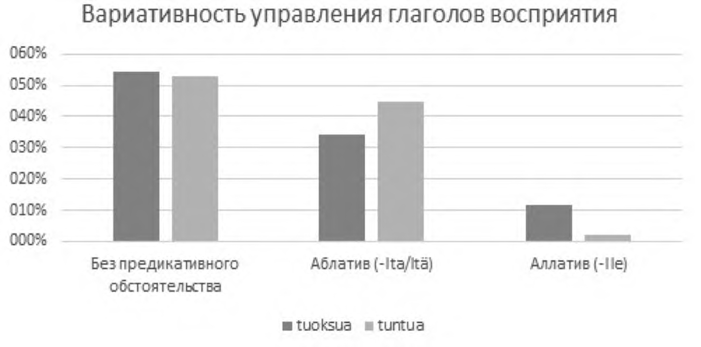 Из группы глаголов общего восприятия для анализа был выбран глагол tuntua, у которого фиксируется целый ряд значений: «1) чувствоваться, ощущаться; 2) быть на вкус, на ощупь; 3) (по)казаться; 4) чувствоваться, быть заметным» [Вахрос, Щербаков 1975: 660]. Несмотря на то что традиционные словари глагольного управления предлагают только один нормативный вариант падежной формы, а именно аблатива (-lta/ltä) [Jönsson-Korhola, White 2006: 138], в словарных статьях можно встретить и контекст употребления аллатива (-lle). Например, tuntuu nololta, nololle lähteä ‘кажется неловким уйти’ и jk tuntuu (käteen) karkealta, kostealta t. karkealle, kostealle ‘что-то кажется наощупь жестким, влажным’ [Kielitoimistosanakirja].