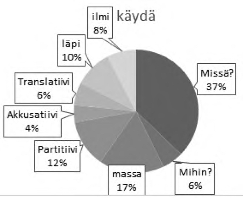 Анализ 500 контекстов глагола tuoksua (группа чувственного восприятия), 500 контекстов глагола tuntua (группа конкретного восприятия) и 1000 контекстов глагола käydä показал, что использование местных падежей с конкретными глаголами придает глаголу или выражению переносное значение, которое лишь отдаленно ассоциируется с положением в пространстве.