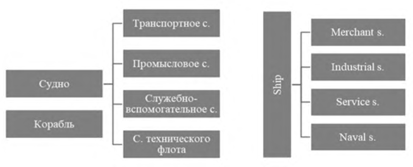Мы провели контекстный анализ, дефиниционный анализ и логико-понятийный анализ русскоязычной синонимичной пары «судно – корабль» и англоязычной пары ship – vessel, в результате чего пришли к выводу, что несмотря на то что термин судно и термин ship выступают в качестве прототипических ядер терминосистем «Судостроение» и “Shipbuilding” – терминосистем, которые с переводческой точки зрения рассматриваются как параллельные и эквивалентные, эти два термина имеют неидентичную семантику, то есть мы наблюдаем терминологическую асимметрию на семантическом уровне.
