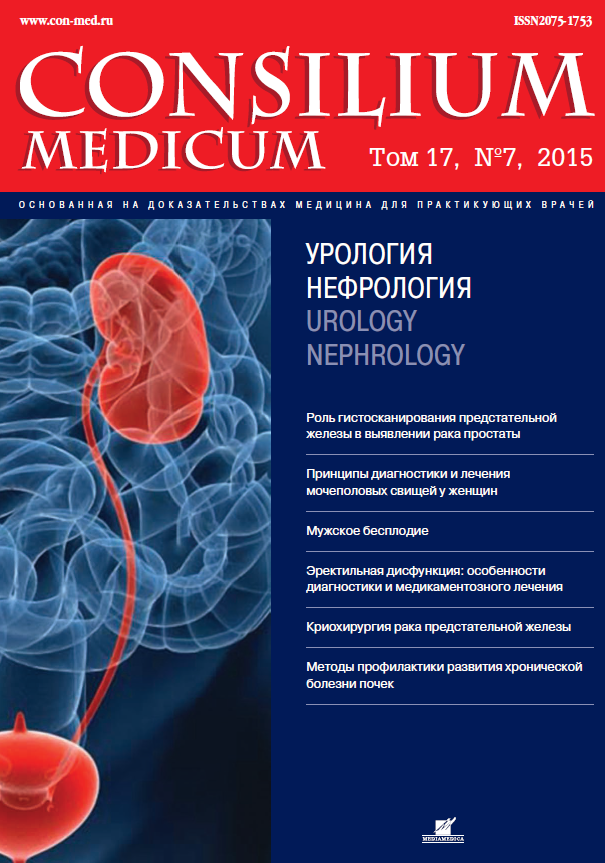 Relevance. Chronic kidney disease (CKD) - a progressive disease, which is comparable to the prevalence of diabetes mellitus, hypertension and obesity, leading to serious complications, high disability and mortality of patients. Epidemiological studies to identify risk factors for CKD are changing traditional notions of the relatively low incidence of kidney disease. Identification of risk factors for CKD and research microalbuminuria (MAU) are the available methods of prevention, allowing timely adjustments to lifestyle, physical activity, assign medical diet, nephroprotective therapy slows the progression of chronic kidney disease, reduce the risk of severe complications and treatment costs. Goal. To study the prevalence of risk factors for CKD and severity among MAU patients of Advisory Diabetes Center in Ivanovo city. Material and methods. To determine the prevalence and risk factors of CKD severity in 52 MAU women and 10 men 58-85 years old, average age 68.3±5.3 years, sought medical help in an advisory Diabetes Center conducts research and MAU survey using questionnaires created on the initiative of the Scientific Society of Nephrology Russia in 2011 to determine the risk factors for CKD analyzed questionnaires. MAU investigated using test strips "Mikroalbufan" (by Lachema) and diagnosed by the level of urinary protein excretion in the range of 30 to 300 mg/day, as well as the ratio of albumin/creatinine urine. The presence of MAU indicates the ratio albumin/creatinine urine in men - 2.5-25.0 mg/mmol in women - 3.5-25.0 mg/mmol. An interpretation of MAU research results is also stated. Main results. The majority of patients surveyed in the advisory Diabetes Center, were identified by the main risk factors for CKD. In 82% of patients on observation were diagnosed with 1st degreeobesity. More than half of surveyed patients had arterial hypertension (AH) I-II stage. One third of patients suffer from type 2 diabetes, another 14% of patients in the presence of hyperglycemic diabetes currently require clarification. It should be noted that the absolute majority of patients had family history of GB and other cardiovascular diseases. According to the analysis of questionnaires, created on the initiative of Russian Scientific Society of Nephrology, the kidney changes were revealed in less than 20% of the patients, but complaints of possible renal failure (swelling, pain in the lumbar region, frequent urination) were submitted by more than 1/3 of patients which will undoubtedly require further in-depth survey, followed by a pathogenetic therapy. The studied MAU patients who applied to the consultative Diabetes Center, the prevalence of MAU in patients with various risk factors for CKD was mixed. The highest severity and frequency of MAU (90%) have been reported with the combination of several of the most important risk factors for CKD - type 2 diabetes, obesity and hypertension (p<0.05). In patients with type 2 diabetes with hypertension compared with patients with type 2 diabetes without hypertension is 2 times higher absolute values of the MAU (102.1±36.1 and 53.7±23.8 mg/g, respectively; p<0.05) and the ratio of albumin/urinary creatinine (11.6±4.1 and 6,1±2,7 mg/mmol to 1l, respectively); p<0.05. Test conducted twice within 1 month of test strips "Mikroalbufan" by Lachema. Discussion. The majority of patients who applied to the consultative Diabetes Center, discovered the most important risk factors for CKD: obesity, type 2 diabetes and hypertension. In the presence of obesity in the overwhelming number of patients (82%), only 14% have a satisfactory physical activity, while 31% do not pay attention to her. More than half of surveyed patients have hypertension stage I-II, but of these only 57% receive regular antihypertensive therapy. Against the background of antihypertensive therapy in 56% of patients are not achieved target BP. It should be noted that 26% of the surveyed have a family history of diabetes and require in-depth examination to rule out disorders of carbohydrate metabolism. The studied MAU patients who applied to the consultative Diabetes Center, diagnosed MAU varying frequency and severity. The highest prevalence (90%) and severity of the MAU (p<0.05) were observed with a combination of major risk factors for CKD - type 2 diabetes, obesity and hypertension. Conclusion. Carrying out the survey using questionnaires, created on the initiative of the Scientific Society of Nephrology Russia in 2011, and the definition of MAU in patients seeking medical care in the Diabetes Advisory Centre, revealed the high prevalence of major risk factors for CKD (obesity, type 2 diabetes and hypertension), as well as the early stage of CKD. The study of the prevalence of the major risk factors for CKD according to the analysis of questionnaires allows the further prevention of the development of chronic kidney disease in the early stages of development and in a timely manner to assign low-protein diet and ketoanalogs of essential amino acids (Ketosteril), pathogenetic therapy and renal protection.