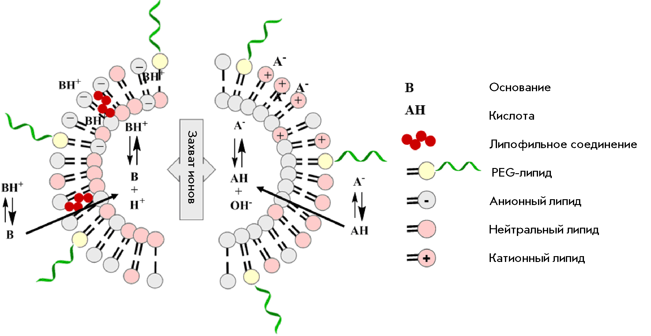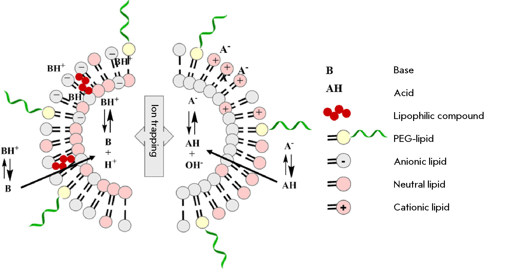 Liposomes. Designing liposomal dialysates is an emerging area of research. Liposomes without drugs, “empty liposomes”, were used as scavengers for exogenous and endogenous toxic molecules. Some of these studies have reached clinical trials. It is quite possible that liposomes will be medically used as nanoantidotes in the next decade [74]. The introduction of “empty” liposomes contributes to reservoir formation for toxin binding. Liposomes bind toxins through electrostatic interactions and a hydrophobic effect in the membrane or through ion trapping into the hydrophilic core. Non-ionized molecules penetrate the liposome membrane. They are captured by a hydrophilic, pH-controlled core of liposomes. For example, a weakly basic drug molecule, upon entering a hydrophilic core with an acidic pH value can be ionized and lose its ability to diffuse through the lipid bilayer of liposome membrane (Fig. 4).