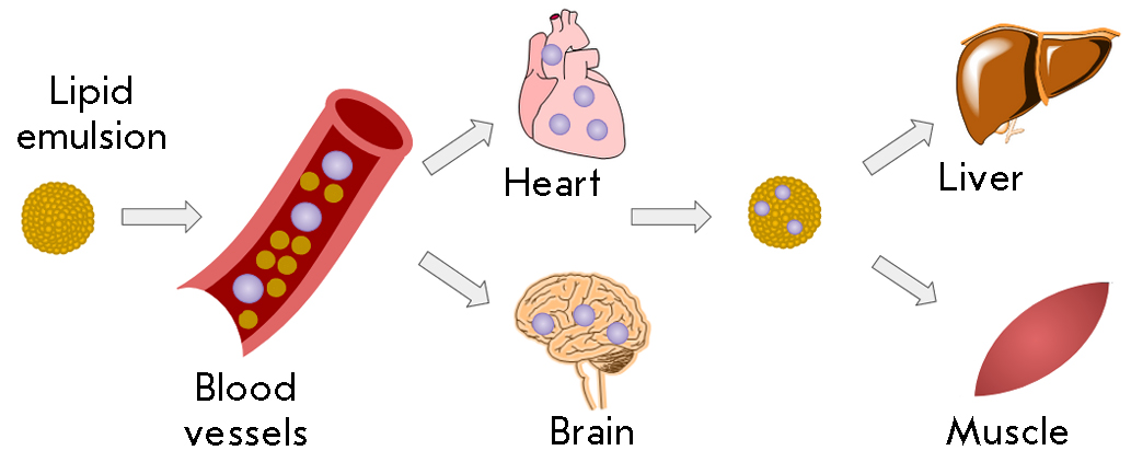 Fig. 1. LE action mechanism in human body: the toxins are captured by lipid emulsion in high-perfusion organs, such as the heart and brain, to be transported to the liver and muscles for further redistribution. Adapted from [49]