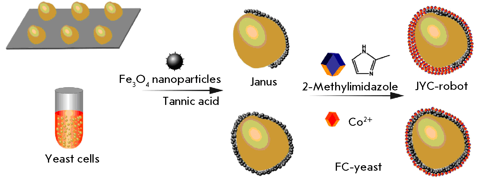 Biomimetic hybrid systems. Janus micromotors are magnesium and gold particles coated with a red blood cell membrane (RBC-Mg) that acts as a bait and absorbs and neutralizes biological toxins in water and biological media. RBC-Mg nanomotors have been used to rapidly detoxify α-toxin and methylparaoxon, models of membrane-damaging toxins and chemical warfare agents, respectively [69, 70]. Hybrid biomembrane nanorobots with an acoustic drive and a membrane consisting of two types of cells (erythrocytes and platelets) effectively bind to both toxins and pathogens in the blood. To eliminate simultaneously pathogenic bacteria and toxins the proteins located in the hybrid membrane are used. They bind to pathogens and neutralize pore-forming toxins [71, 72]. There are examples [73] of microrobots with Fe3O4 nanoparticles covering yeast cells and creating a zeolite imidazolate framework-67 (ZIF-67) to neutralize mycotoxins (Fig. 3).