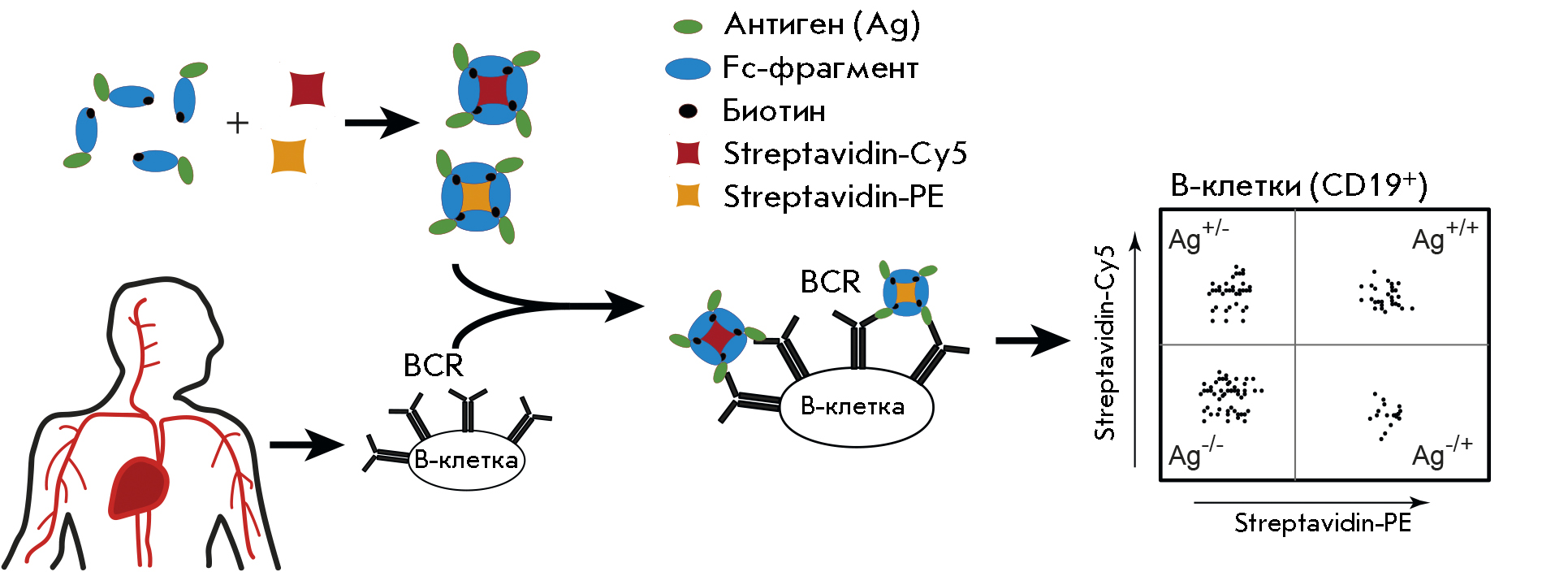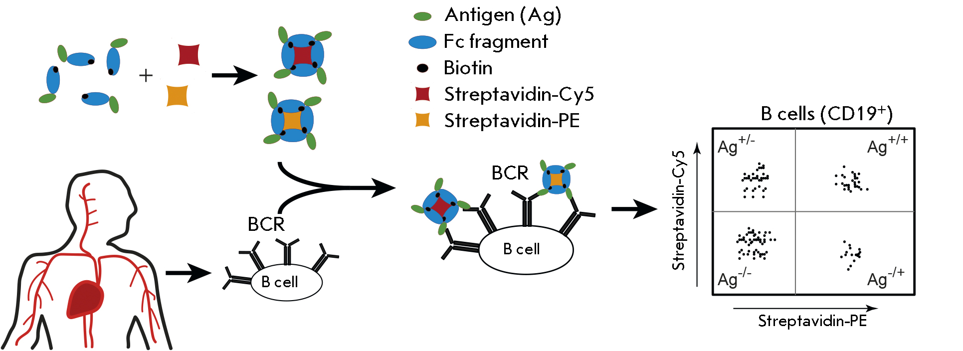 Рис. 1. Схема анализа профиля антигенспецифичности B-клеток с использованием метода «двойной положительной» окраски
